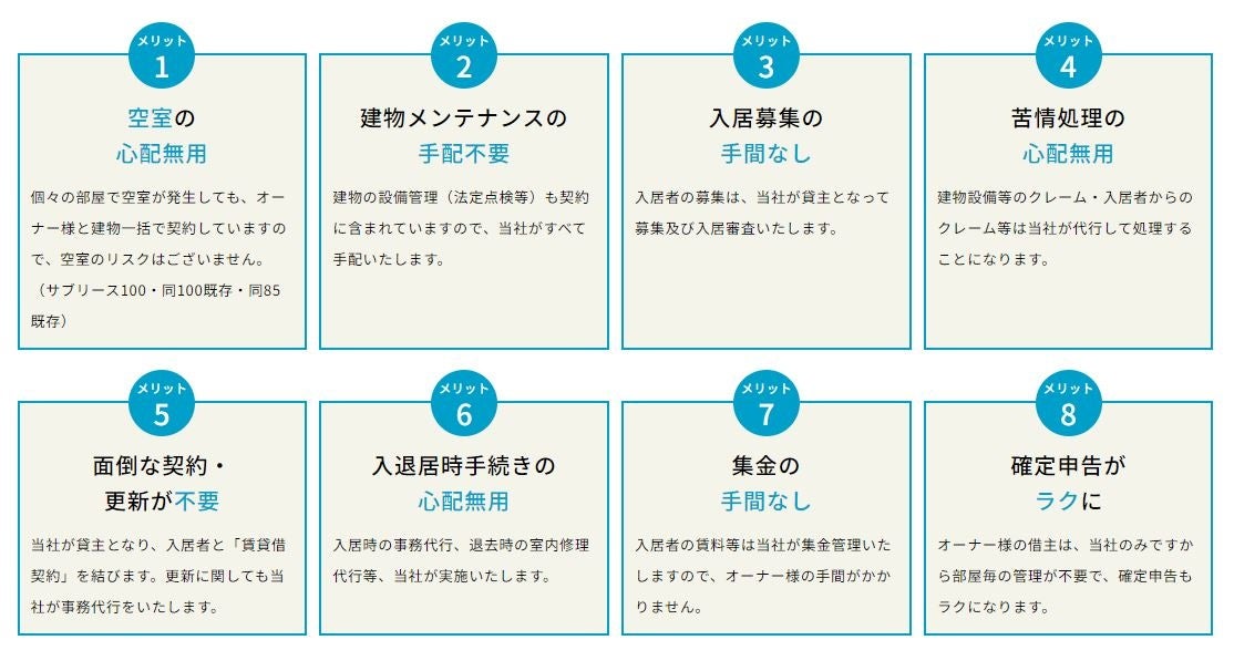 結果として、オーナー様は収益が安定するだけでなく、賃貸管理業務の煩わしさからも解放されることが可能となります。