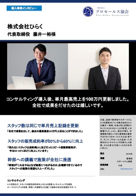 営業支援を行う一般社団法人プロセールス協会(東京都港区:代表理事 小沼勢矢)が提供するコンサルティング導入後、スタッフ数は変わらずに単月の売上記録を更新し、販売成約率を20%から60%へと大幅に向上させた、大阪と滋賀で整骨院やスポーツジムを運営する株式会社ひらくの導入事例を公開しました。