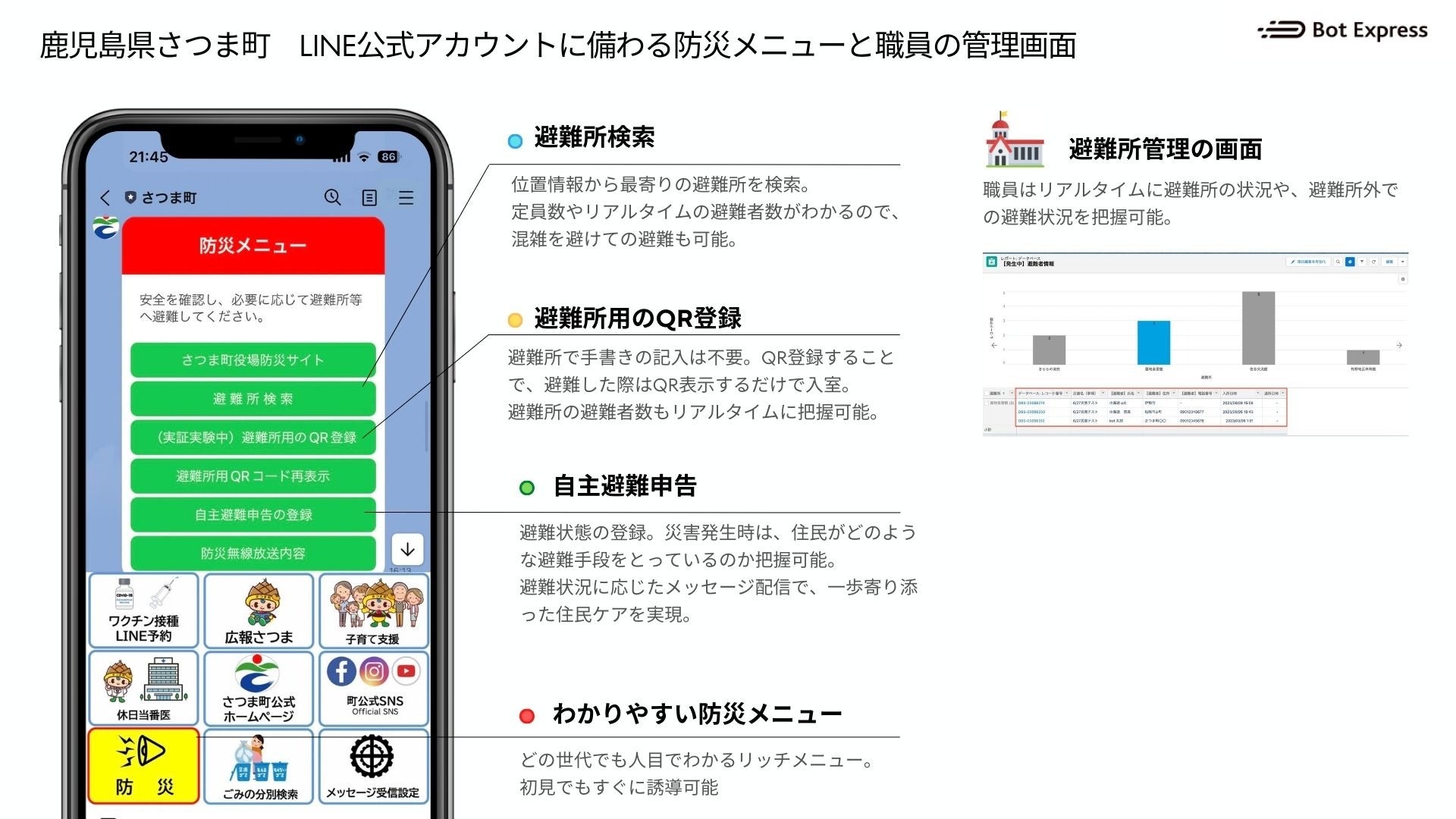 また、高齢化率も高く、スマホを使いたがらない住民への対策は継続的課題であり、既存の避難が必要となる方との連携方法も検討中です。将来的には「避難者がQRコードを持参して避難する」という行動変容が日常化するために、今後もBot Expressさんと多くの機能改善に取り組みたいと考えています。