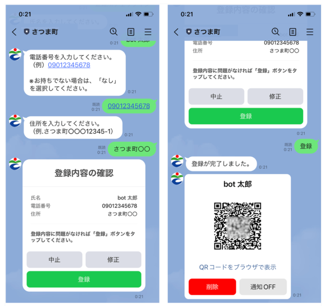 住民は、避難者名簿に記載していた情報(氏名、電話番号、住所)を、さつま町LINE公式アカウントから登録し、専用のQRコードを発行します。避難当日はこのQRコードを見せるだけで避難手続き完了。一度登録しておくだけで何回でも使用する事が可能です。(※一人のLINEアプリで複数人の登録も可能)
