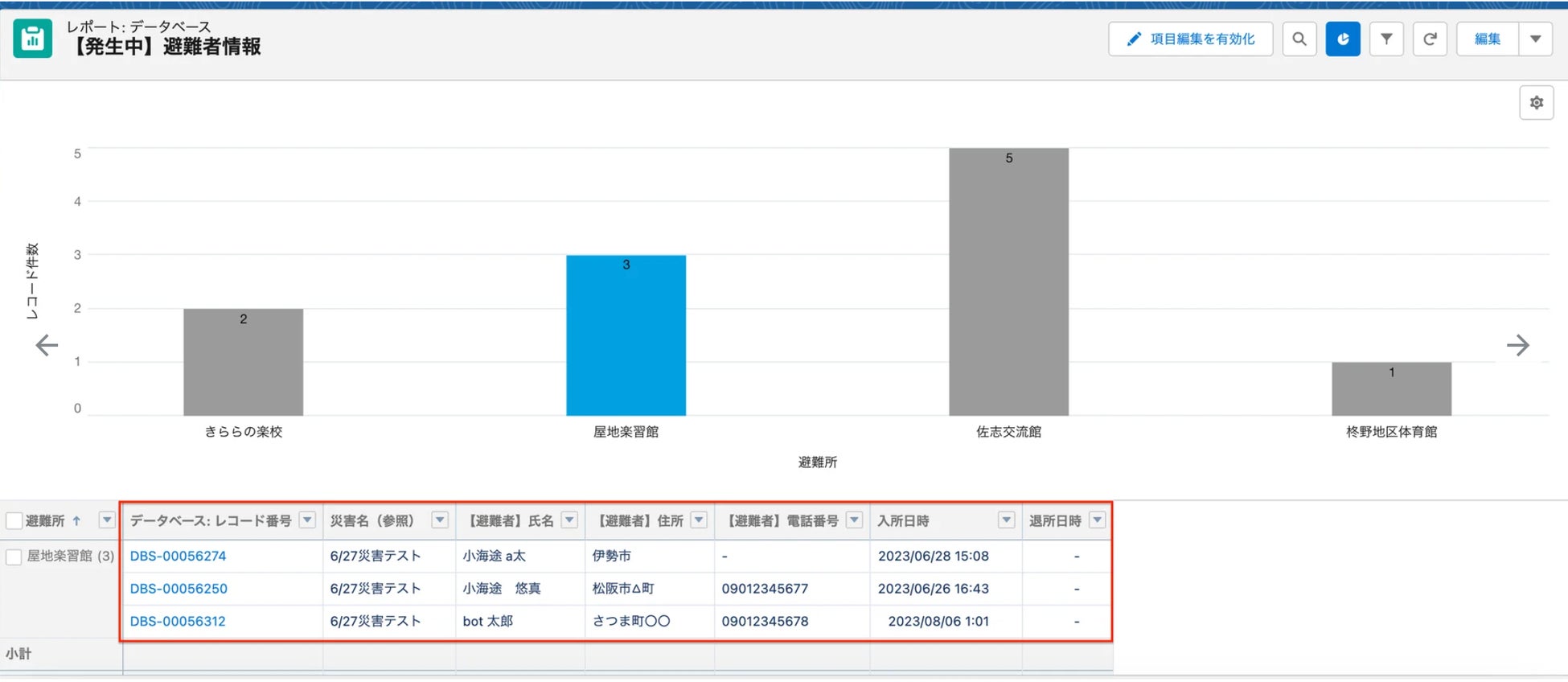 全避難所の状況をリアルタイムで把握することが出来ます。特定の避難所のみの抽出や、過去の避難状況の確認なども可能です。