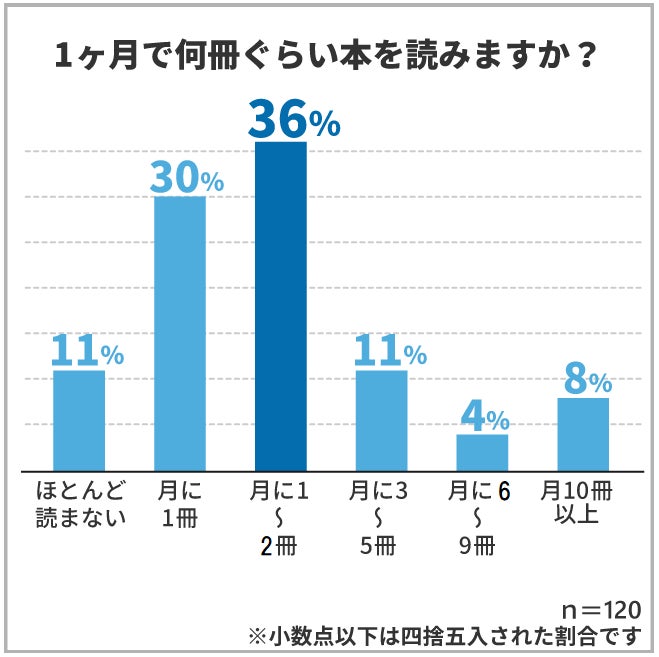 男女120人に「月に何冊ぐらい本を読みますか?」と聞いたところ、「月に1~2冊」が36%、「月に1冊」が30%、「ほとんど読まない」が11%と月に本を読むのが2冊以下の方の割合が7割を超える結果となりました。