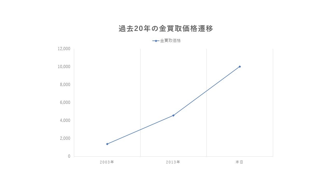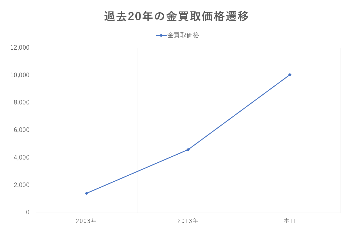 本日9/19、金1gあたり10,038円を記録し金買取価格が1万円を突破しました。10年前の2013年平均買取価格4,591円に対しておよそ2倍となり、更に20年前の2003年平均買取価格1,406円に対してはおよそ7~8倍にも膨れ上がりました。そこで今回は、誰もが想像していなかった金買取価格1万円を機に他店さまでは中々お目にかかれない全ての金製品を本日限定で手数料なしでお買取させていただきます。