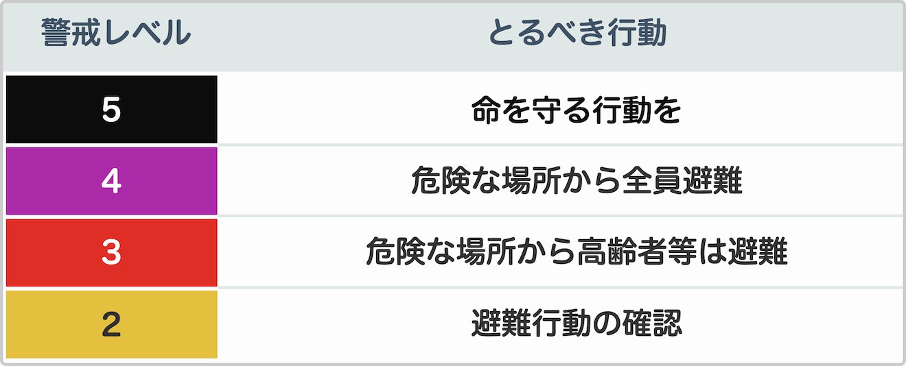 今回の気象庁の改善は、大雨災害時に住民が避難するタイミングをよりわかりやすくすることを目的として、2021年5月に内閣府により実施された「災害対策基本法の改正」(※4)によって変更された避難情報に対応しています。自治体から発令される「避難情報」と「大雨危険度」のレベルが一致することで、通知・掲載された大雨危険度に対する「とるべき行動」がわかりやすくなります。