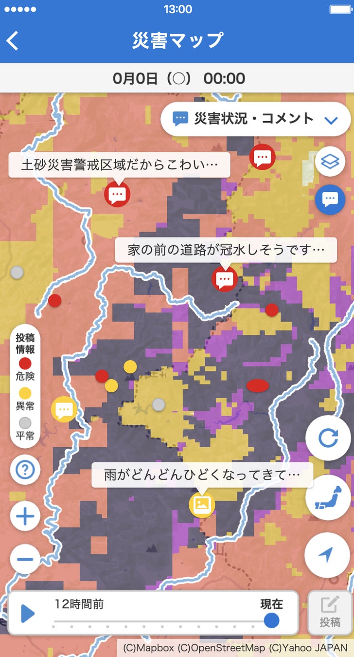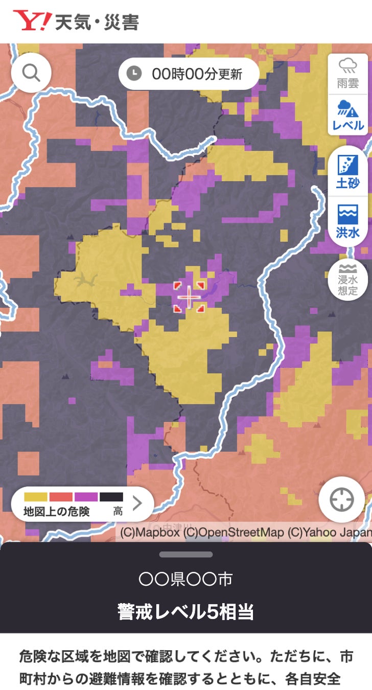 Yahoo! JAPANは、この改善に合わせ「Yahoo!天気・災害」で提供している土砂災害と洪水の危険度がリアルタイムにわかる「大雨警戒レベルマップ」と、「Yahoo!防災速報」で提供しているユーザーによる現在地の災害状況を地図上でリアルタイムに共有できる「災害マップ」に、警戒レベル5相当の表示を開始しました。