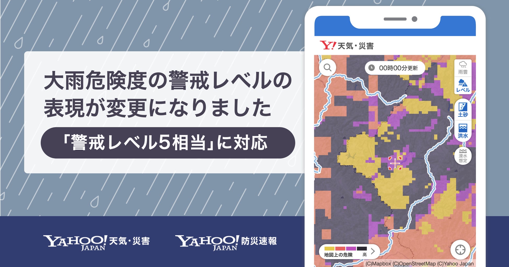 ヤフー株式会社(以下、Yahoo! JAPAN)は本日、「Yahoo!天気・災害」(PC版、スマートフォンブラウザー版)や「Yahoo!防災速報」(iOS版、Android版)、「Yahoo!天気」(iOS版、Android版)などのサービス(※1)にて、気象庁の「大雨・洪水警報の危険度分布(キキクル)」と「大雨危険度通知」の改善(※2)に対応し、大雨危険度の警戒レベルの表現を変更しました。(※3)
