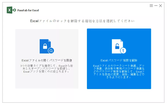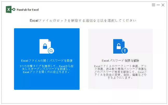 専門ツールPassFab for Excelはパスワードの入力なしで全種類のエクセルパスワード解除に対応する裏ワザともいえる方法です。3種類のパスワード回復モードを備える「Excelファイルの開くパスワードを回復」機能ではエクセル読み取りパスワードの解析、その他のパスワードは「Excelパスワード制限を解除」からワンクリックで解除できます。