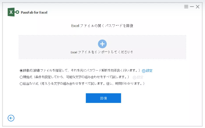 Step2:Excelファイルを追加した後、辞書式・類推式・総当たり式のどれかを選択し「回復」を押します。