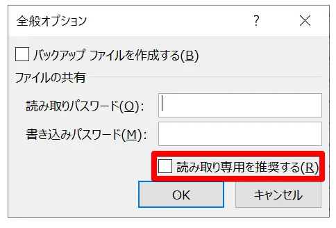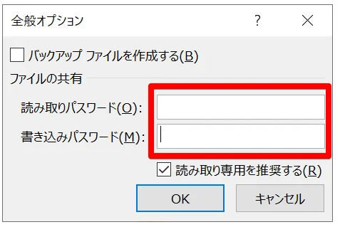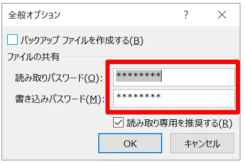 Step5:「読み取りパスワード」と「書き込みパスワード」を設定します。ファイルを読み取り専用にする場合は「読み取り専用を推奨する」にチェックを入れます。