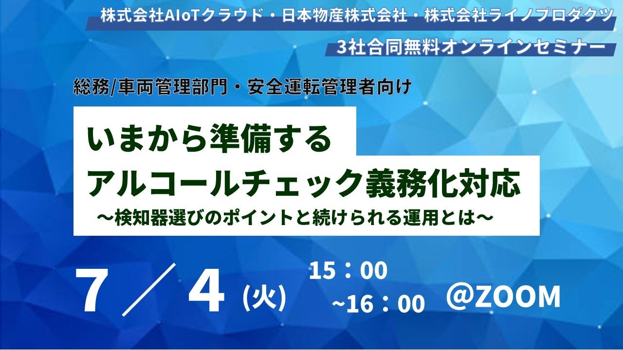 アルコールチェック管理サービス『スリーゼロ』(https://alc.aiotcloud.co.jp/)を提供する株式会社AIoTクラウド(本社:東京都江東区、代表取締役社長:松本 融)と、日本物産株式会社(本社:東京都中央区、代表取締役社長:守口 光徳)、株式会社ライノプロダクツ(本社:神奈川県横浜市、代表取締役:上村 久)は、共催セミナーを7月4日(火)に開催します。