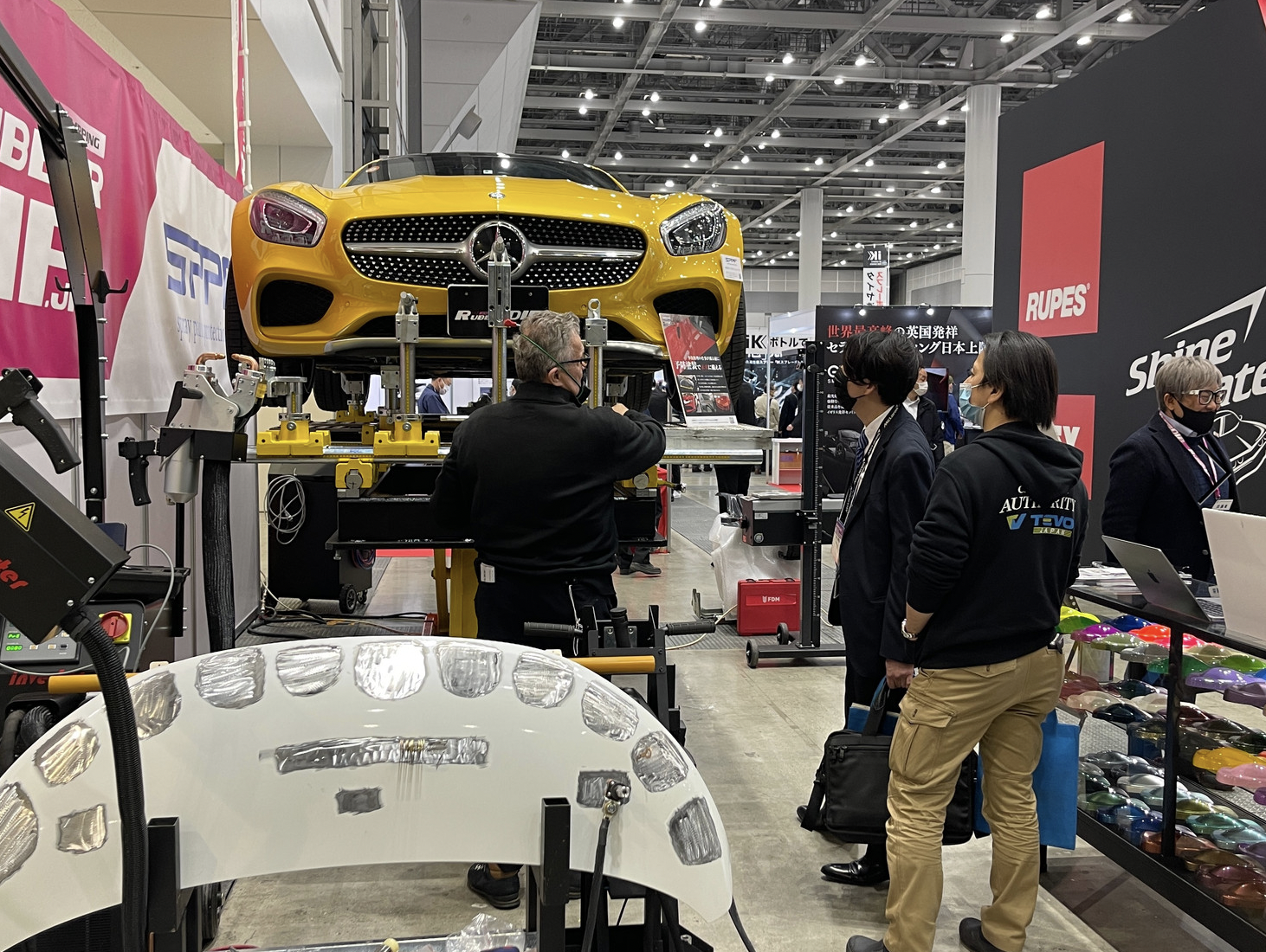 今回の展示ブースではジェットストローク有限会社より、スプレーガンで塗るタイプの剥がせる透明保護塗料「SPPF」や塗って守ってはがせる塗装「ラバーディップ」の展示と共に、ファインピース株式会社より、エフディエムが新たに開発したADAS・EV対応の次世代車体調整・測定機「3WAY多機能ADASリフト(ジグ修正・フレーム測定 × ホイールアライメント調整 × エーミングサポート)」の世界初出展を行う。