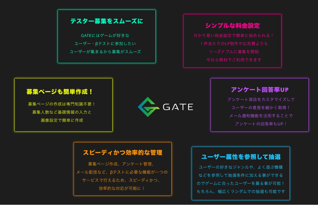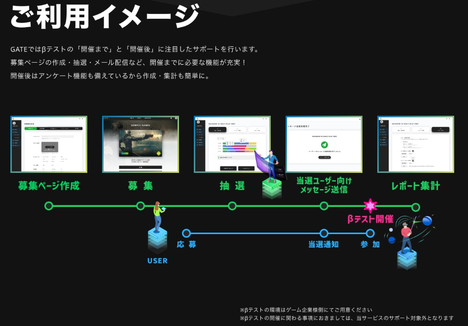 また、テストに参加したいユーザーは、「GATE」に掲載された様々なゲームやゲーム関連サービスのベータテスト募集案件の中から興味のあるタイトルを選び、応募することが可能です。