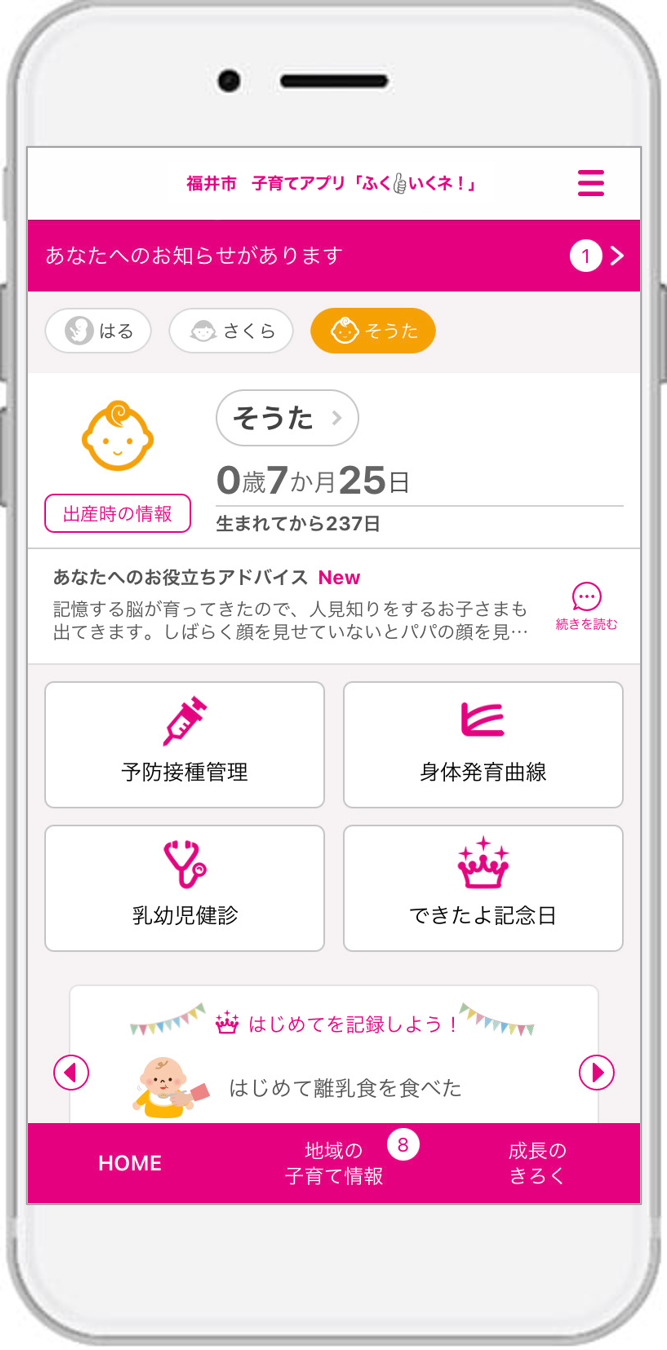 福井県福井市に採用された『福井市 子育てアプリ「ふく👍いくネ!」』は、スマートフォン・タブレット端末・PCに対応したサービスで、妊産婦と子どもの健康データの記録・管理や予防接種のスケジュール管理、出産・育児に関するアドバイスの提供、離れた地域に住む祖父母など家族との共有機能や、市が配信する地域の情報をお知らせするなど、育児や仕事に忙しい母親や父親を助けてくれる便利な機能が充実しています。