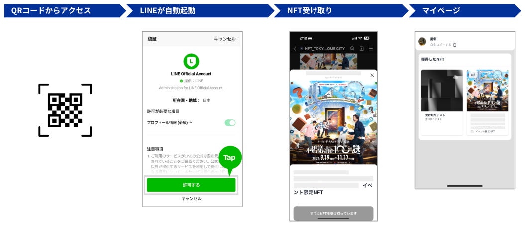 本イベントでは、会場内の物販コーナーでグッズを購入された方を対象に、NFTを特典として配布しました。購入者はQRコード(*1)を読み取り、LINE上で簡単にNFTを受け取り、その保有状況を確認することが可能です。この仕組みにより、NFTの利用が初めての方でもスムーズに体験できる環境を実現しました。