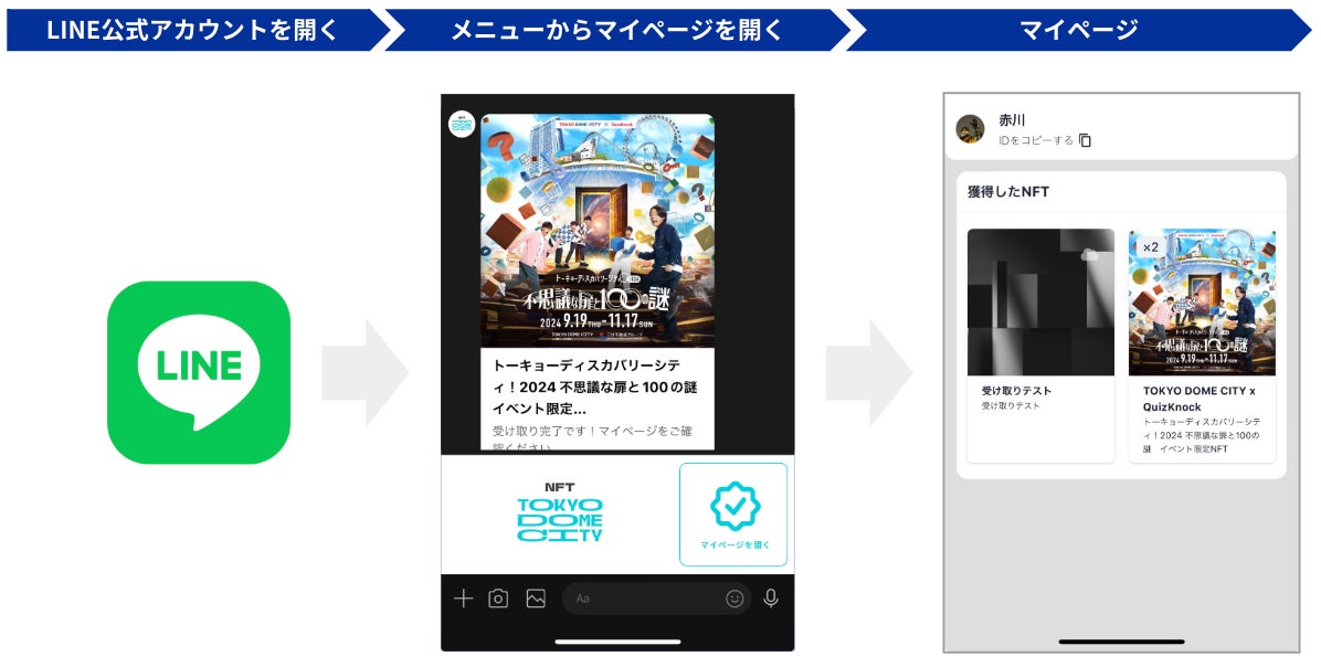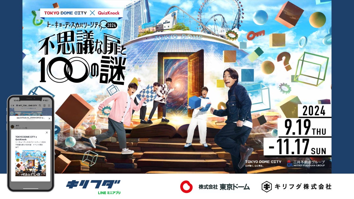 キリフダ株式会社(本社:東京都中央区、代表取締役社長:赤川英之、以下「キリフダ」)は、東京ドームシティとQuizKnockが共同で開催する謎解きイベント『トーキョーディスカバリーシティ!2024 不思議な扉と100の謎』(以下「本イベント」)において、グッズを購入した方への特典としてNFTの配布を行い、2,000名以上の方がNFTを受け取りました。NFTに関わるユーザー体験をLINEで完結させるサービス「キリフダ」が採用され、企画から技術支援までを行いました。