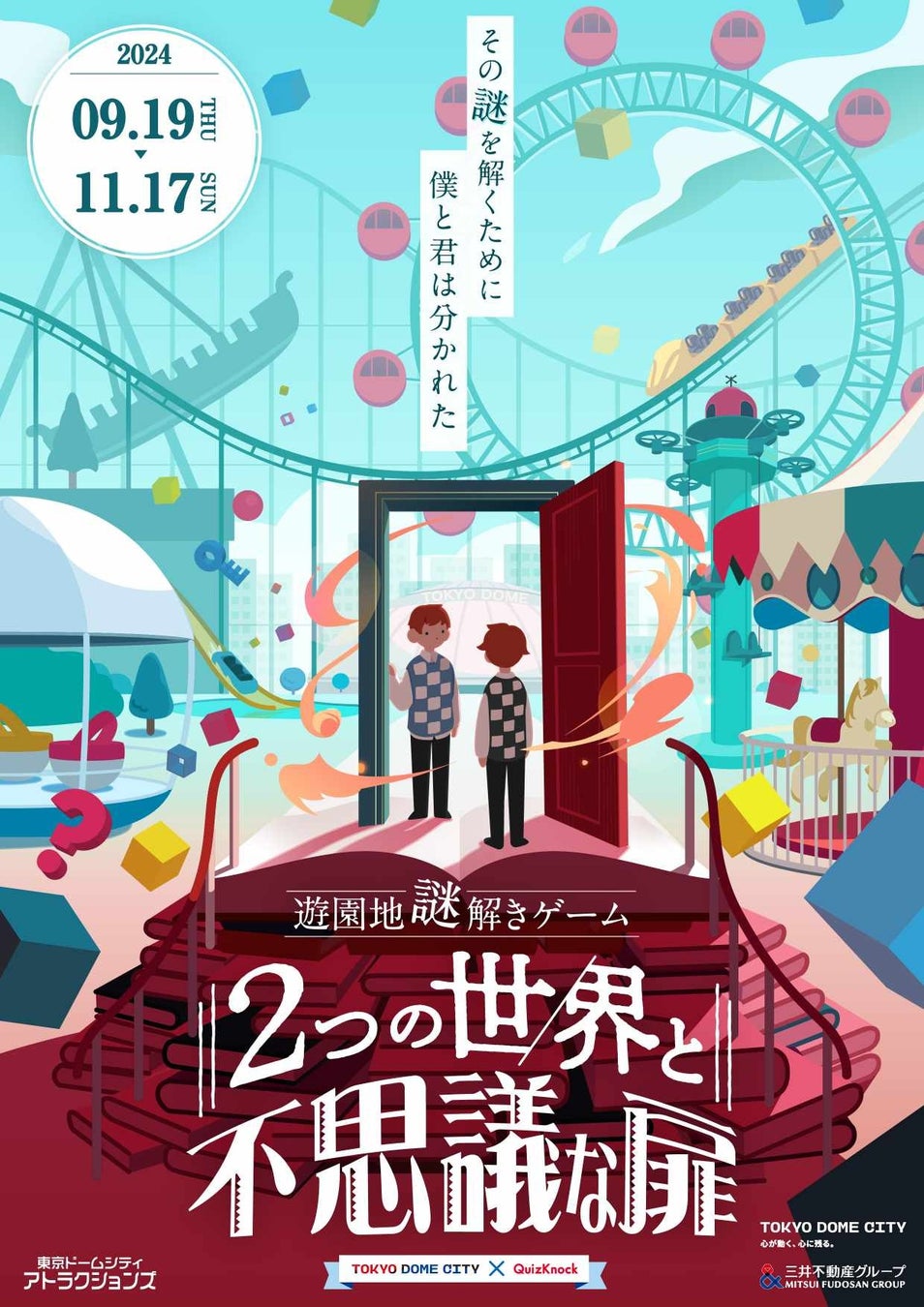 本イベントは、東大クイズ王・伊沢拓司氏が率いるQuizKnockがプロデュースする大規模謎解きイベントで、2024年9月19日(木)から11月17日(日)の60日間にわたり東京ドームシティ全域で開催されました。遊園地を舞台とした謎解きゲーム「2つの世界と不思議な扉」や、シティ全域に散りばめられた100の謎に挑む「シティ回遊謎ラリー」など、参加者が東京ドームシティの様々なスポットを巡りながら楽しむ内容となっています。