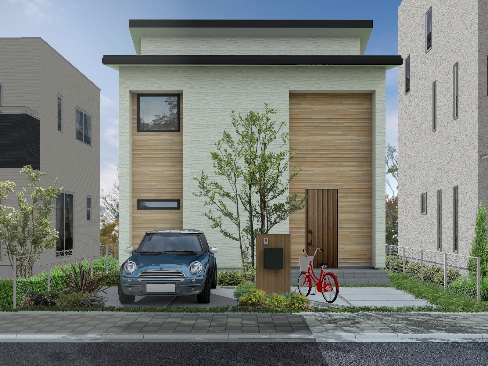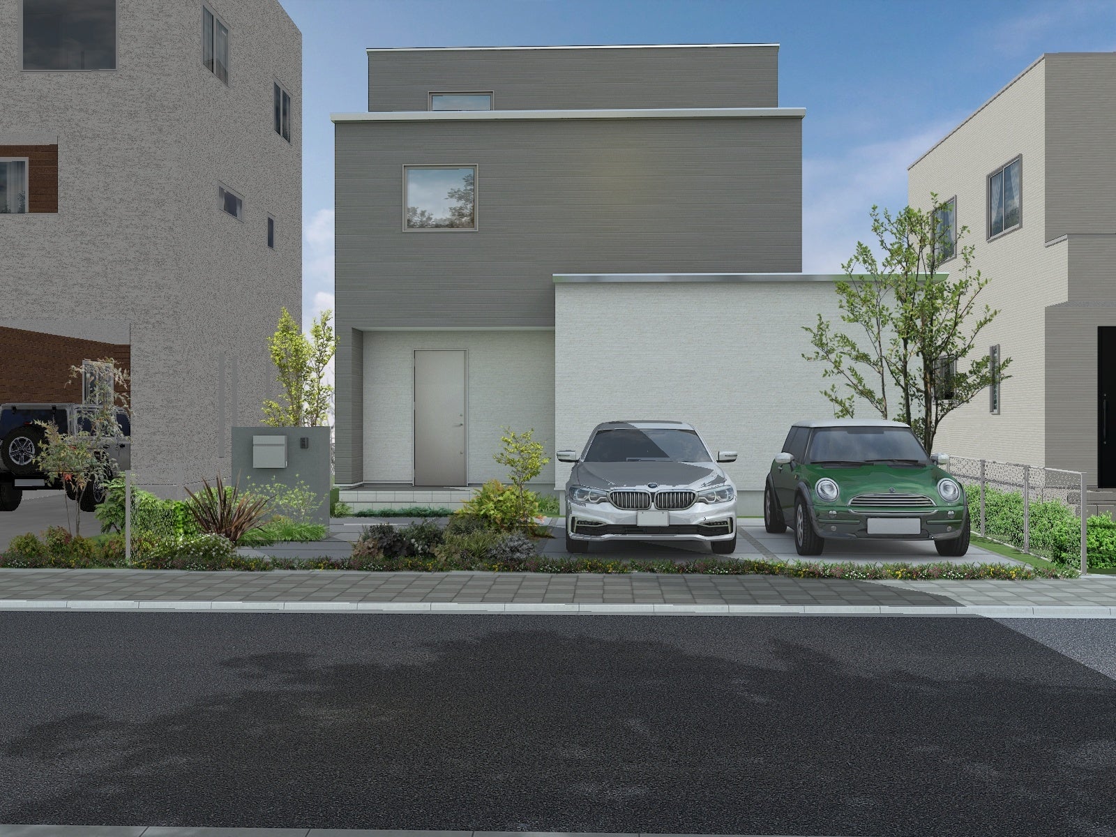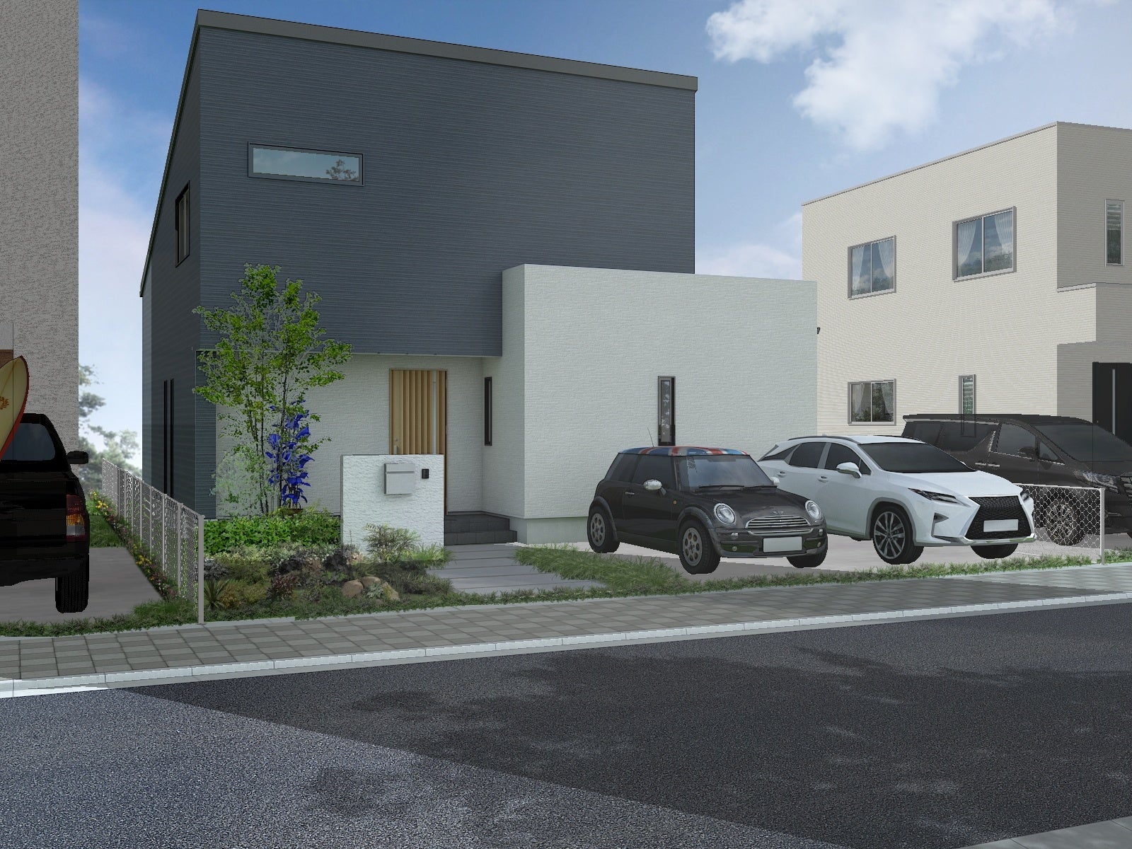 【外観】片流れとBOXの2フォルム 中央に軒下空間がある落ち着いた外観