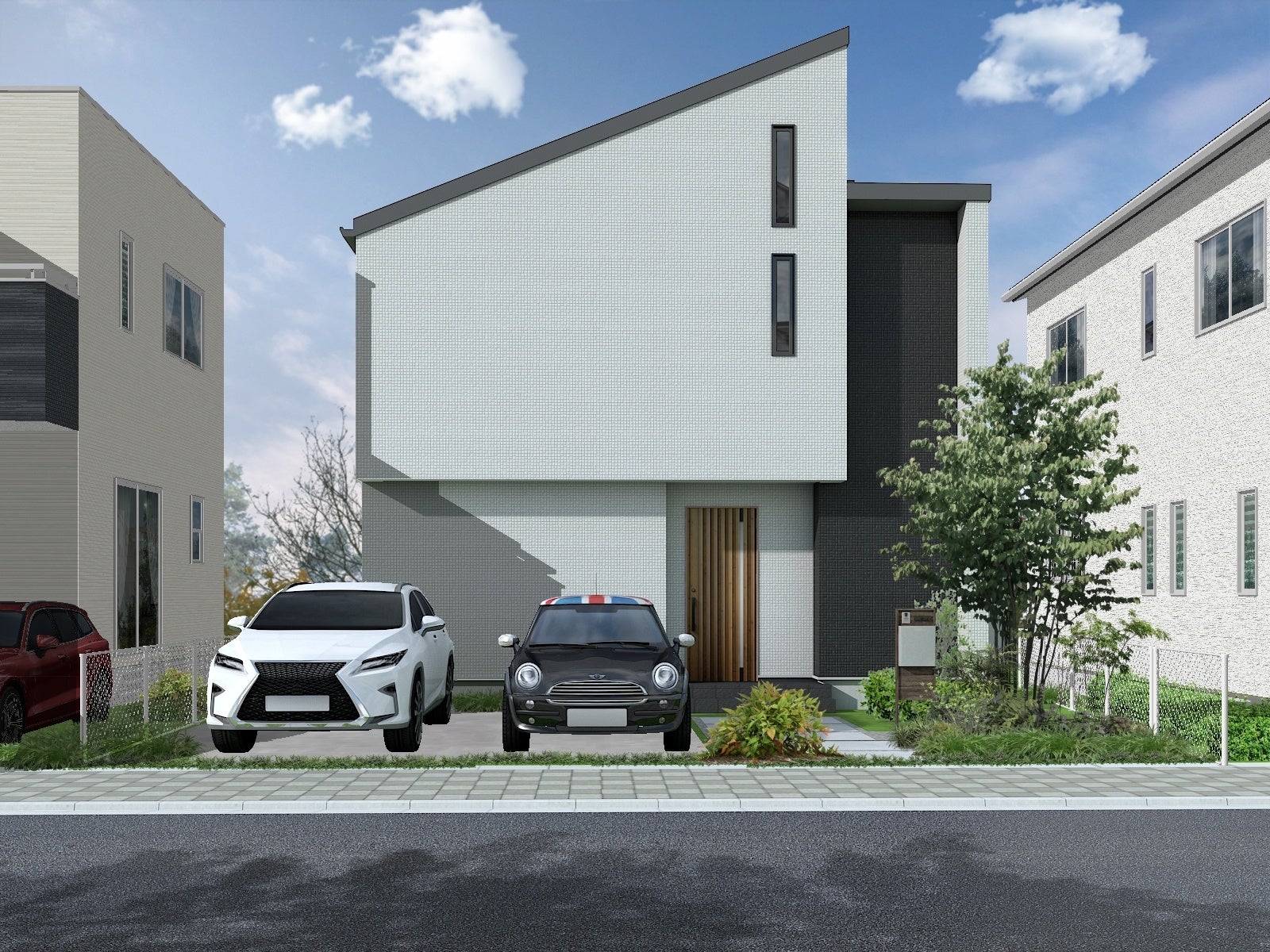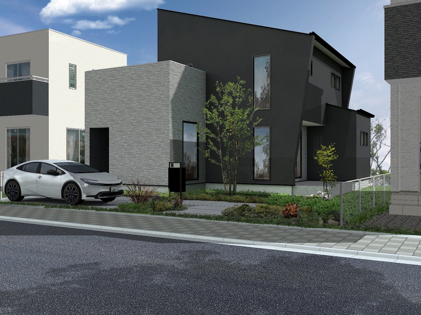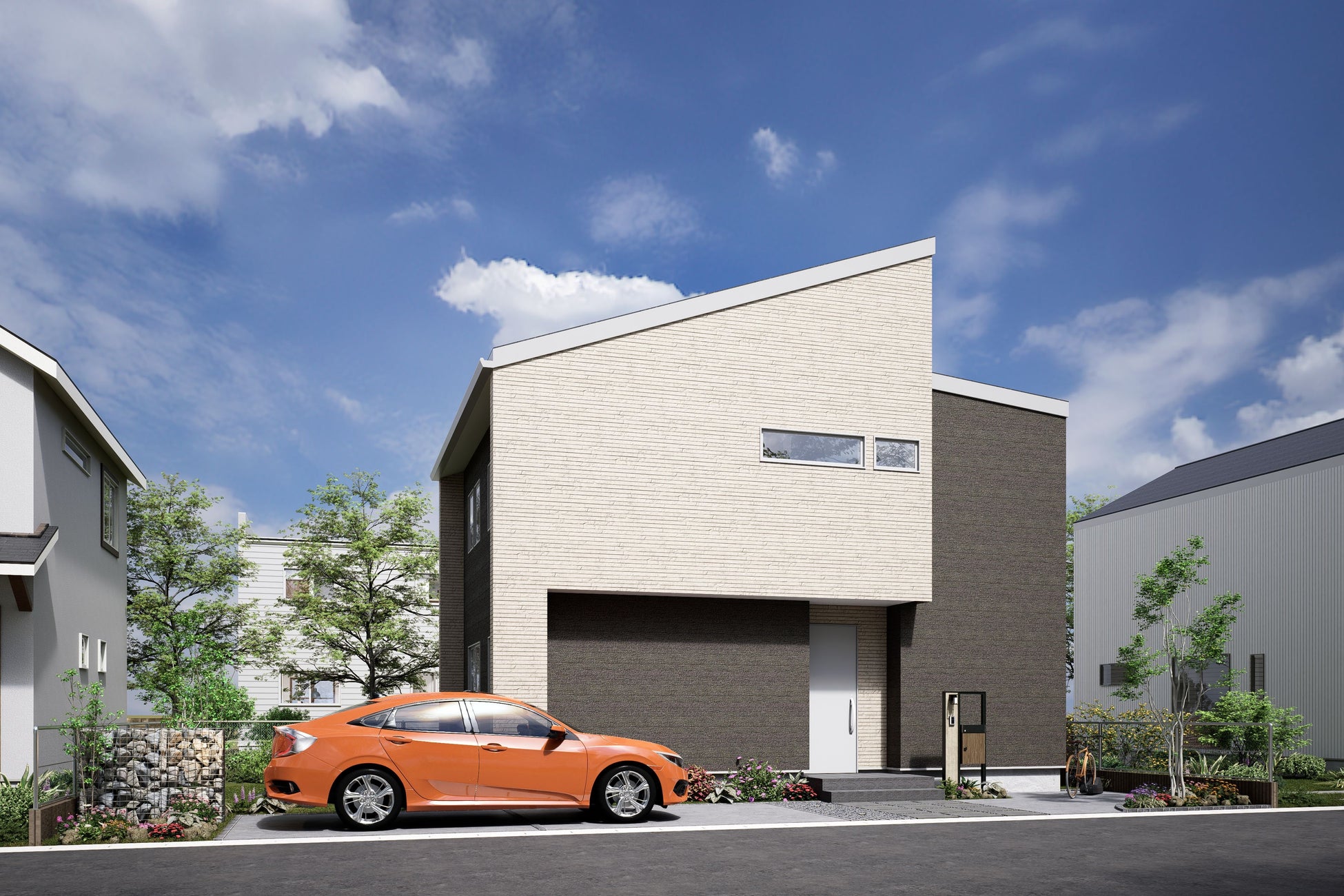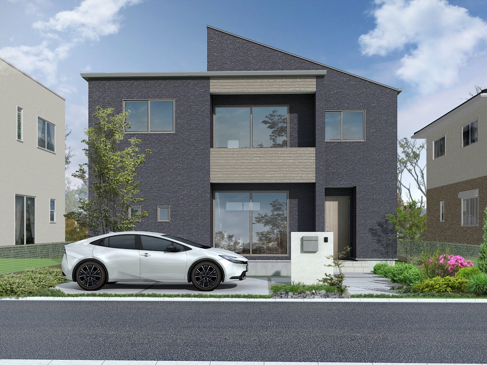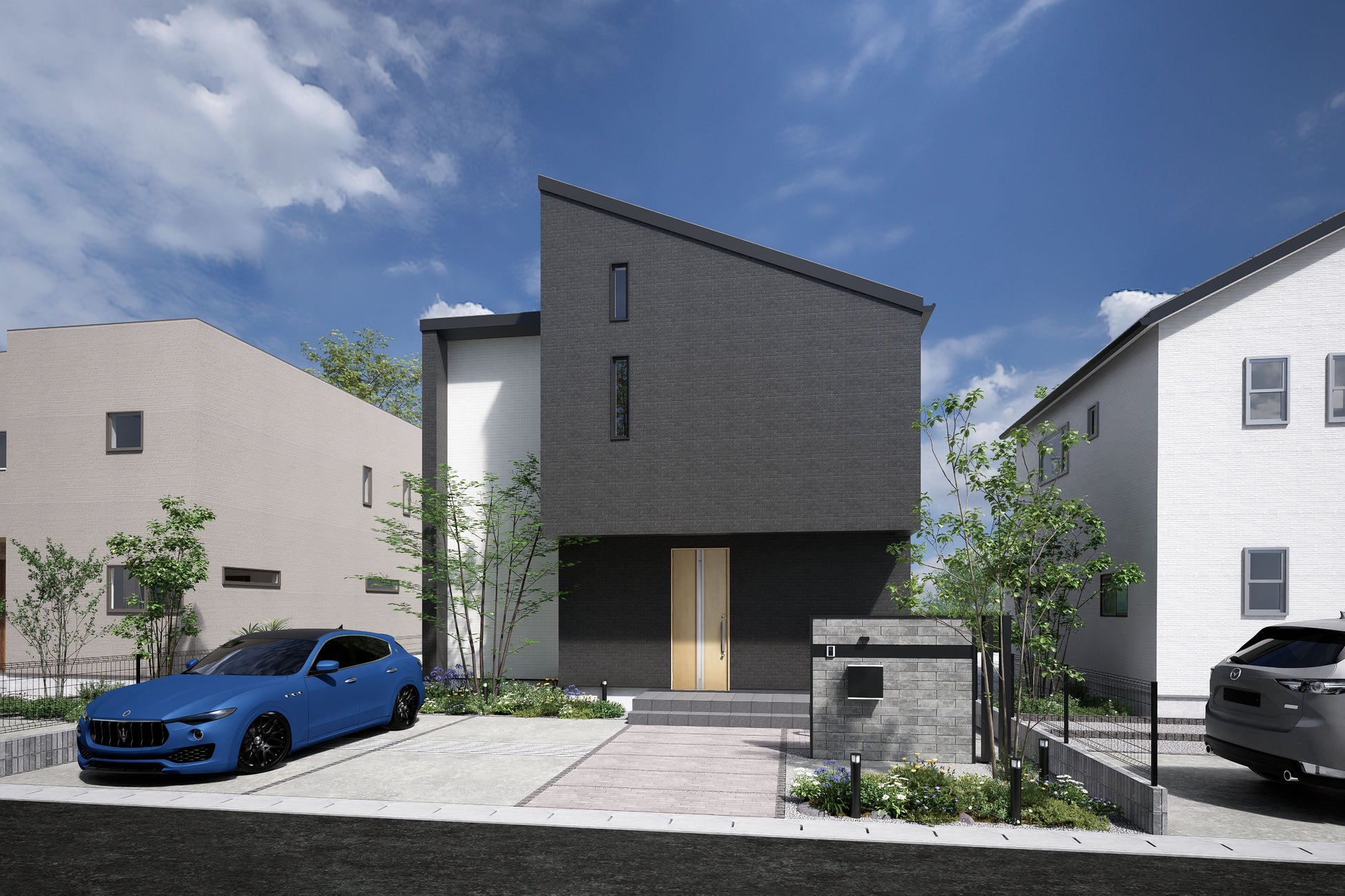 【外観】片流れとBOXの3フォルム 1,2階連続の斜め袖壁が際立つデザイン性が高い外観
