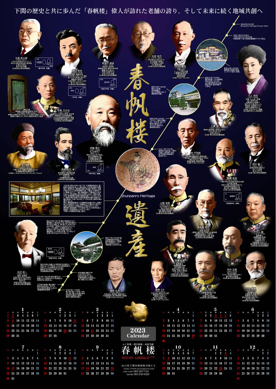 この度、「下関春帆楼」とふぐ料理、そして下関市の歴史と魅力をアピールするため、「春帆楼遺産」と題したオリジナルカレンダーを作成しました。ふぐ刺しを真ん中に配し、右肩上がりの斜め軸に「下関春帆楼」の歴史を記したデザインです。「春帆楼」の名付け親である伊藤博文公、創業者の藤野玄洋・ミチさんを始め、これまでご来館いただいた多くの歴史的著名人の中から、全24名の偉人もご紹介しています。