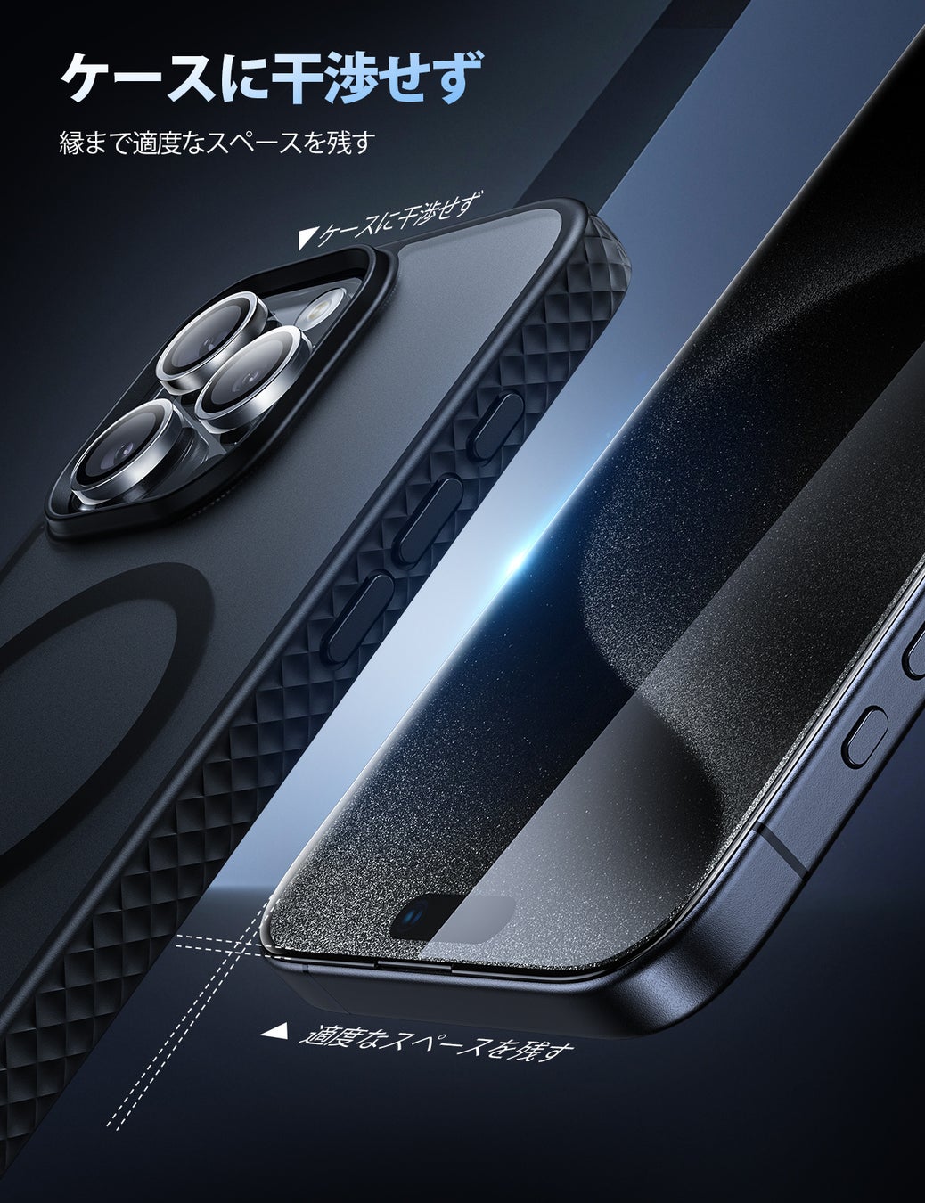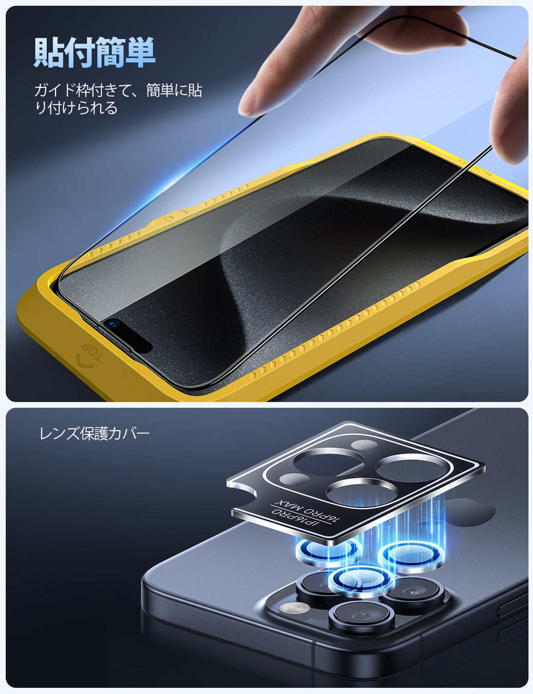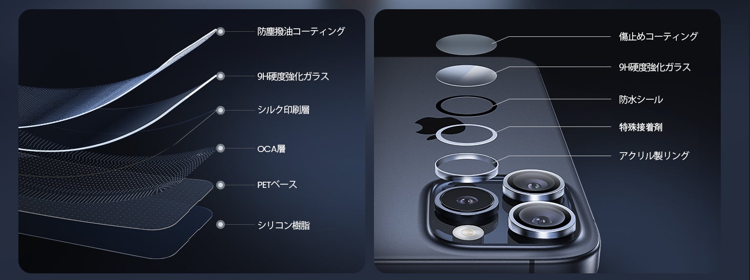 ガラスフィルム表面はAF/AS処理に180-200糸のBAテープ素材と電気メッキ(AR100)(≧112°)技術を採用し、静電気防止だけではなく、指紋防止もできます。ガラスフィルムに高耐久撥水撥油コーティングが施され、フィルム表面での雫の角度が110°以上になり、突然の雨もこれで安心です。ハードコーティング処理により指紋や汚れが付きにくく、付着した水滴や汗、化粧品等を容易に拭き取ることができて、iPhone16本来の美しさをそのままに保つことが可能です。