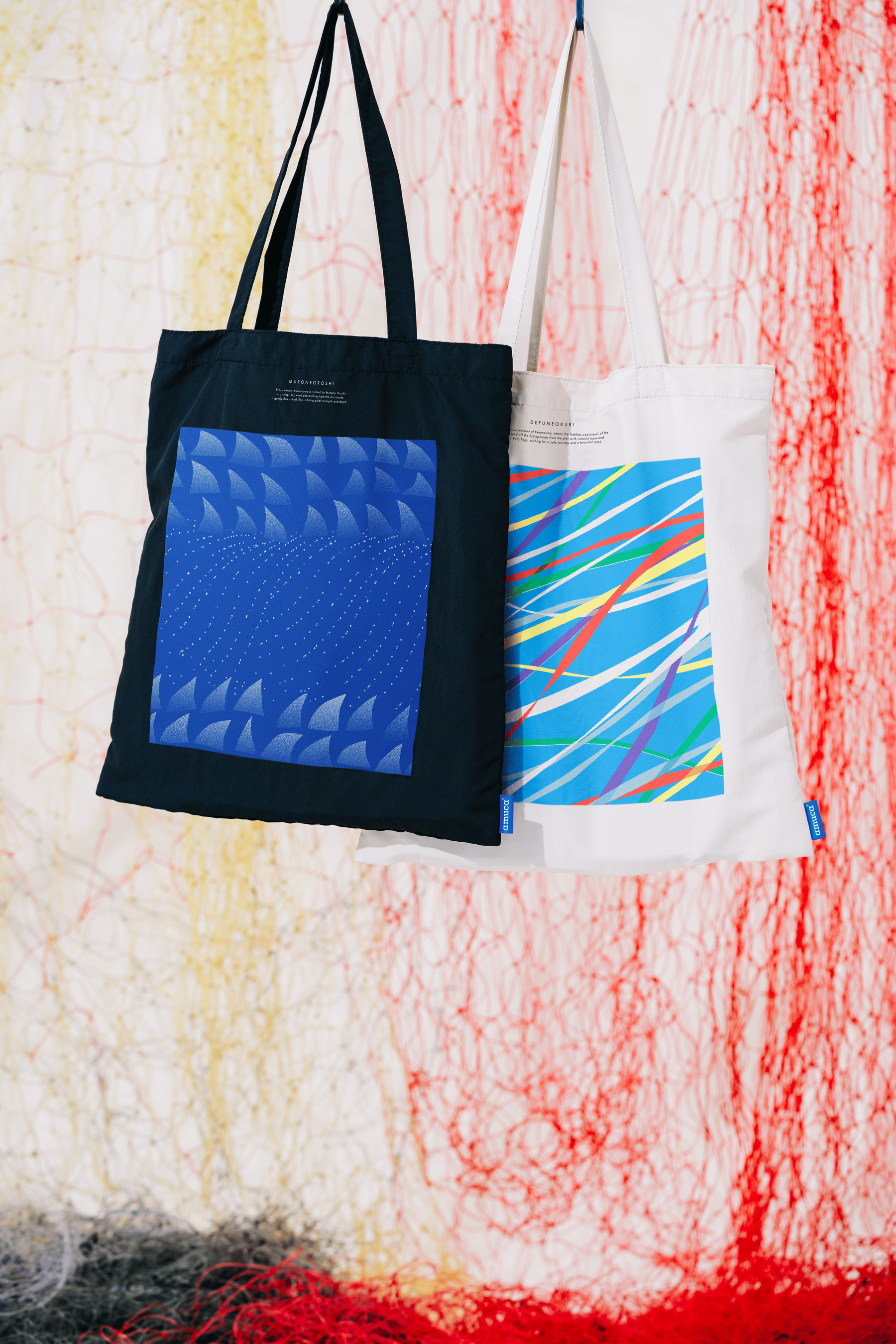 今回販売するamuca®製品は、amu創業の地である宮城県や、沖縄県などから回収した廃漁具が原料に使われています。一部の商品のデザインには気仙沼の文化をモチーフにした2種類のオリジナルテキスタイルデザインを採用しました。
