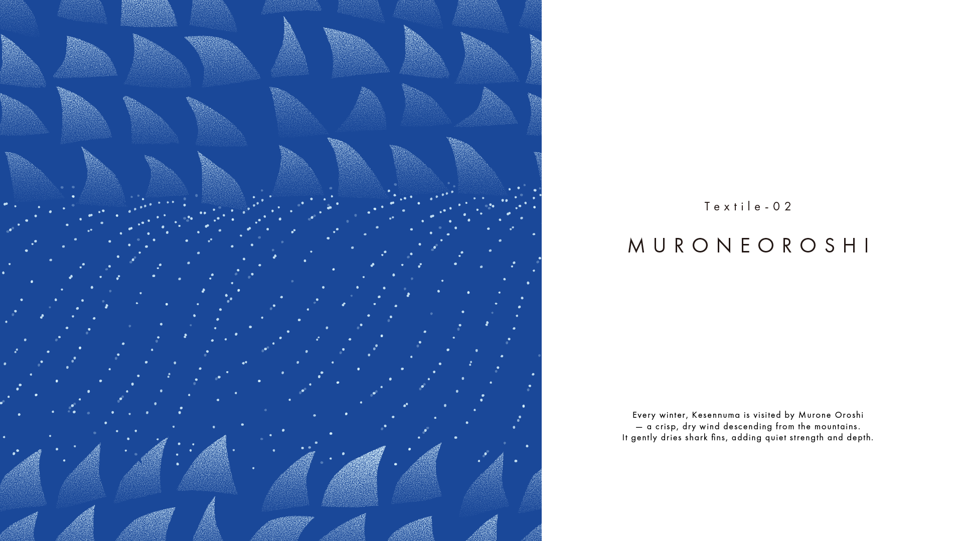 気仙沼の名産品・フカヒレ作りに欠かせない「室根おろし」と呼ばれる風を反映しています。冬の室根山から吹きつける、手の切れるような冷たい風です。この冷たさが、天日干しをしているフカヒレを乾燥させるとともに、吹かれたフカヒレがぶつかり合って鳴らす“カランカラン”という音が、完成の合図になっているそう。過酷な環境を味方に変える力強さを届けたいと思い描きました。