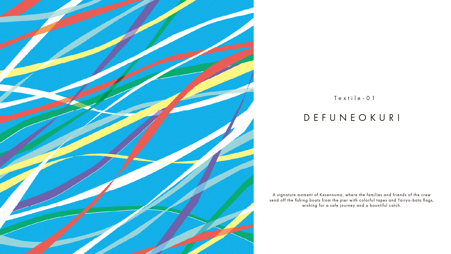 「出船おくり」という気仙沼の伝統行事のワンシーンを切り取ったもの。いざ出航と意気込む船を、乗組員の家族や友人らは、色鮮やかなテープと福来旗(大漁旗)で見送るというのが慣例です。航海の安全と大漁を願う温かく賑やかな景色をテキスタイルに落とし込むことで、プロダクトを使う方の挑戦を見守る存在でありたいという想いが込められています。
