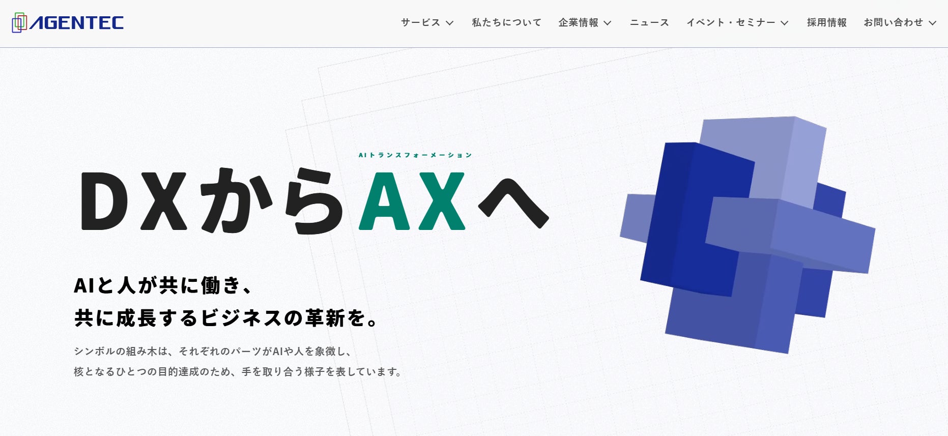 サイトリニューアルに伴い刷新されたシンボルは、私たちが織りなす「共創のカタチ」を表現した3つの階層を持つ「組み木」をモチーフとしています。このデザインには、エージェンテックが提供する価値、組織の在り方、そして「人とAI」の理想像が込められています。