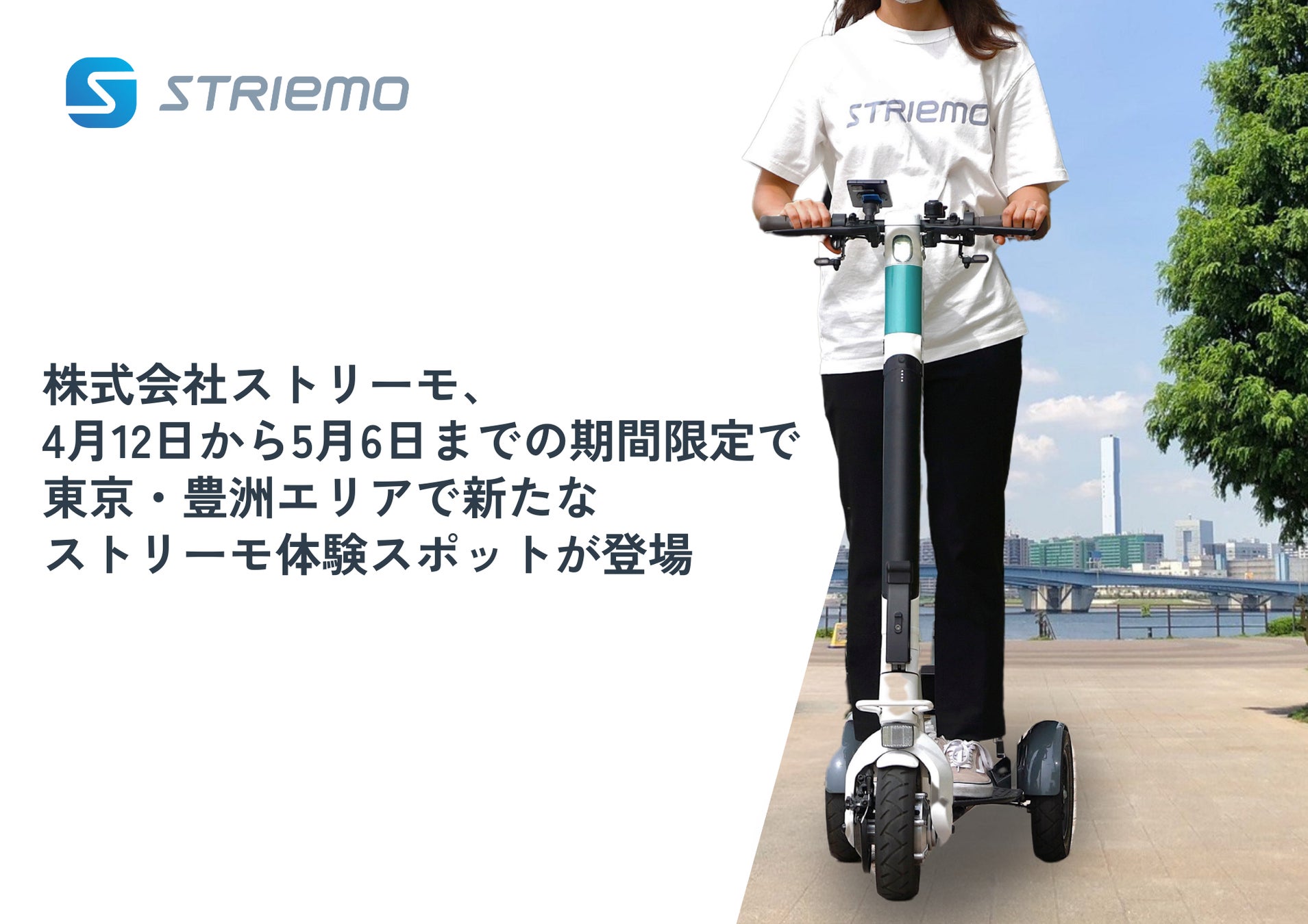 自分のペースで移動できる立ち乗り三輪モビリティを開発する株式会社ストリーモ(本社:東京都墨田区、代表取締役:森 庸太朗、以下「当社」)は、合同会社Limot ・物林株式会社と共同で、4月12日(土)から5月6日(火・祝)の期間中、東京都江東区・豊洲にて歩行者扱いとなる、移動用小型車「ストリーモS01JW」を体験いただける機会を提供いたします。