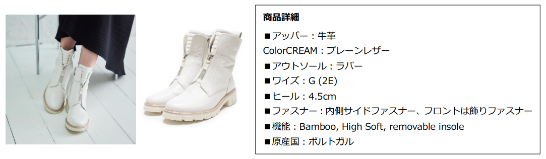 秋冬は白スニーカーから白ブーツへ。存在感がありながらも決してやりすぎにはならない上品さのあるデザインはaraならでは。クリームカラーのレザーにボリューム感のあるラバーソール。フロントジップがコーディネートのアクセントに。