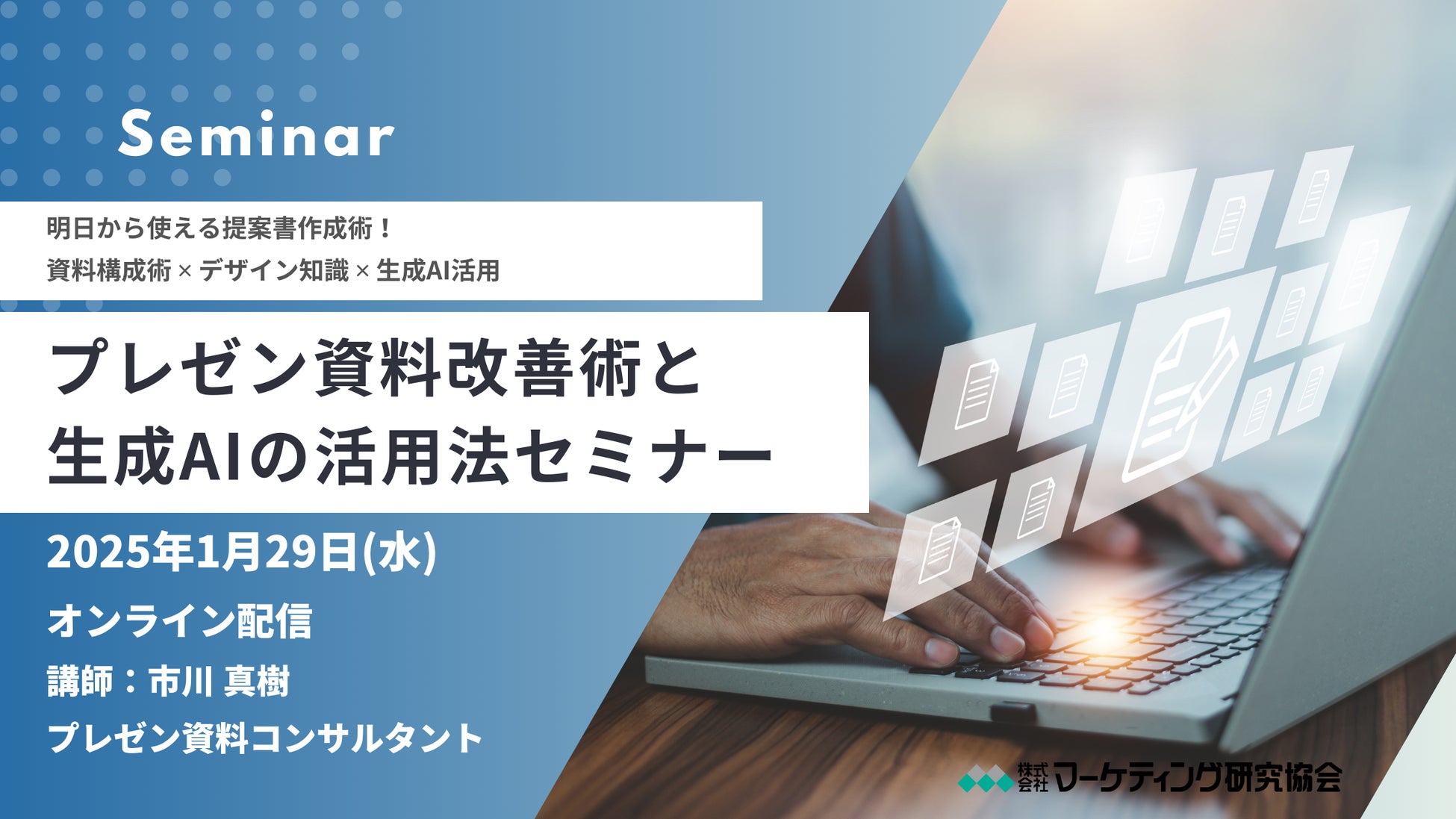 プレゼン資料改善術と生成AIの活用法セミナー 資料構成術 ✕ デザイン知識 ✕ 生成AI活用 1月29日開催株式会社 マーケティング研究協会
