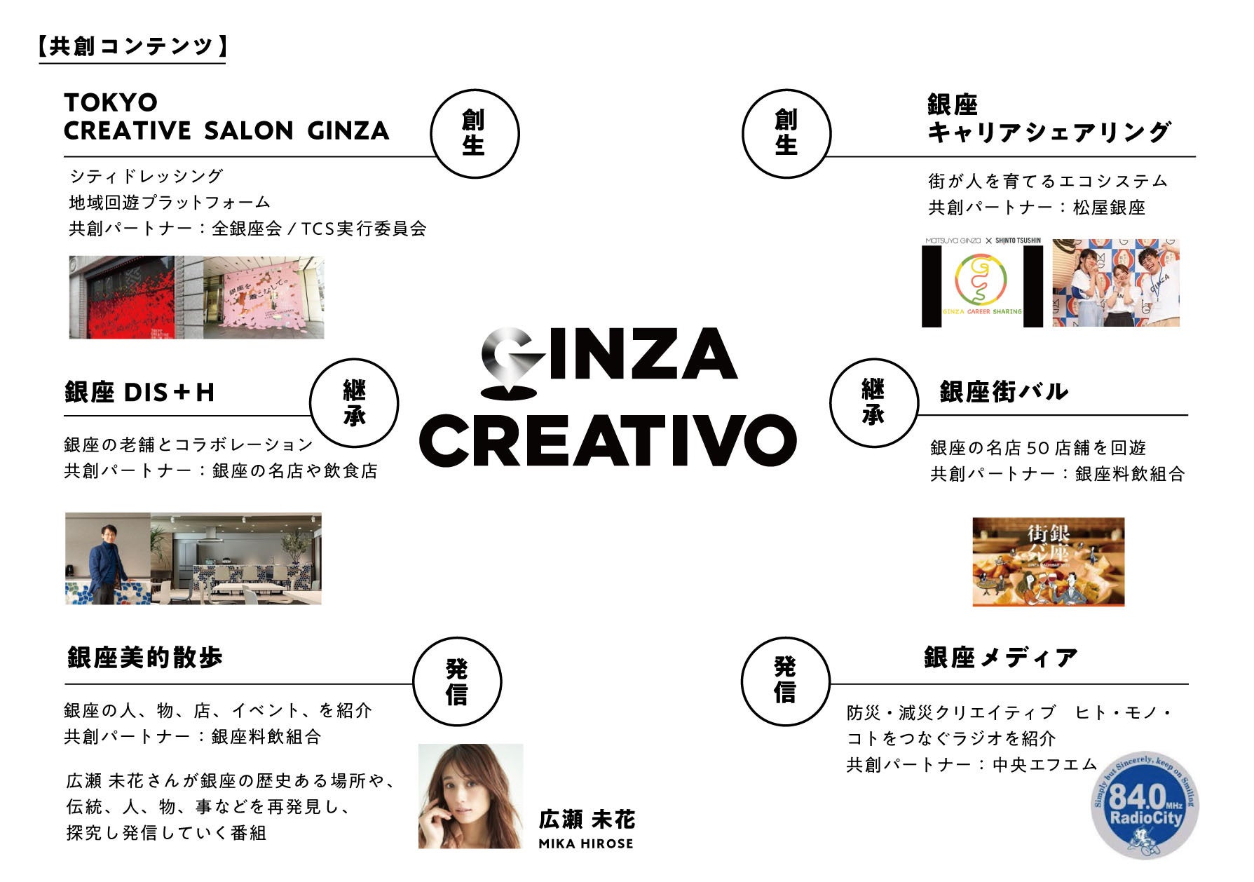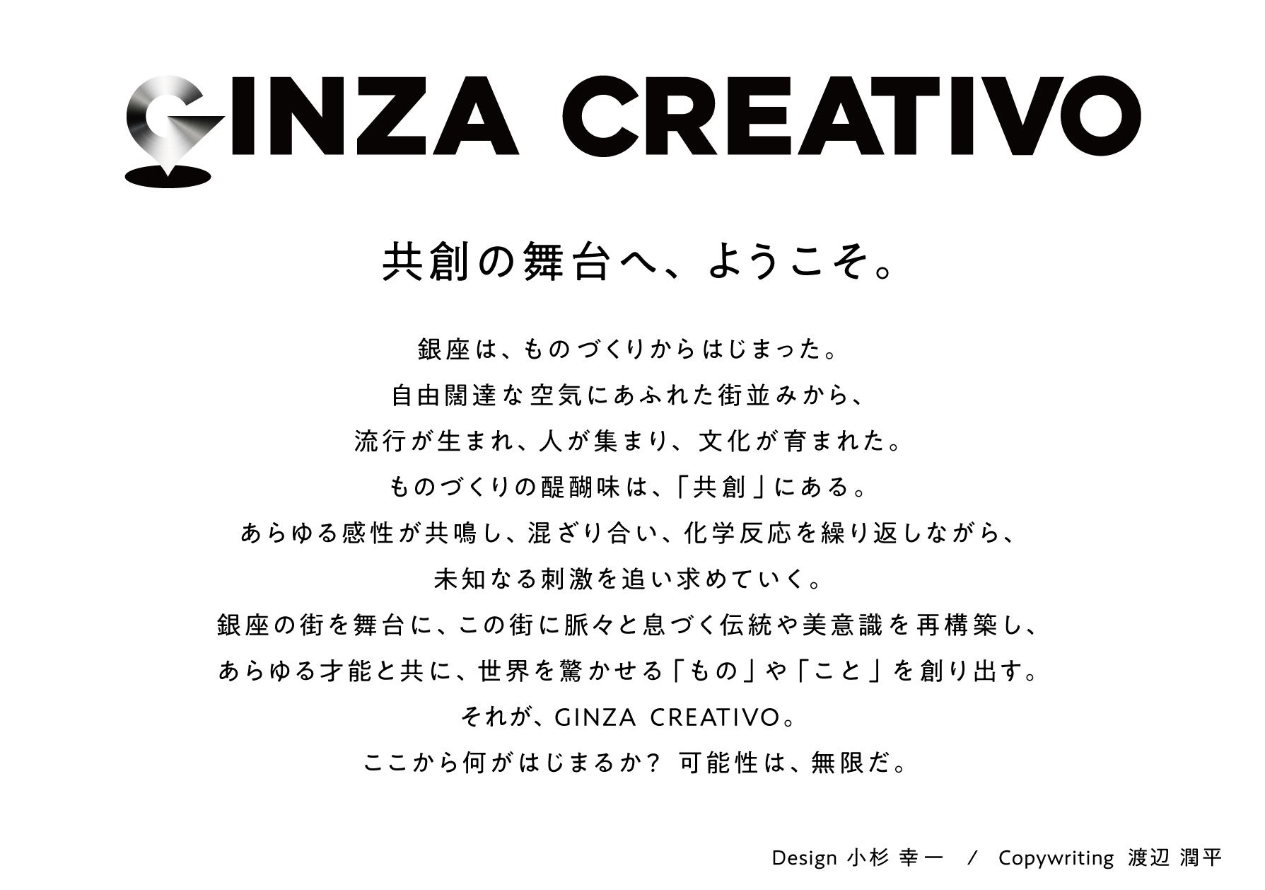 GINZA CREATIVOは、銀座の文化を継承し発信していくために、銀座料飲組合、地域団体や自治体、松屋銀座などの商業施設のサポートも受けながら、すべてのステークホルダーとより良い共創を生み出します。地域に密着し活動されているラジオ局、中央エフエムにも賛同いただき、新たな取り組みも計画しています。共創クリエイターには東京ADC賞やカンヌライオン国際広告祭デザイン部門<GOLD>など国内外多数の受賞歴があるアートディレクター/クリエイティブディレクター/グラフィックデザイナーの小杉 幸一氏や、カンヌライオン国際広告祭や国内外の数多くの受賞歴があり、さまざまな審査員歴もあるクリエイティブディレクター/コピライターの渡辺 潤平氏、アンバサダーにはABC「朝だ!生です 旅サラダ」旅サラダガールズも務めた(2015~2023)Space Craft所属 広瀬 未花氏らも参画。私たちは銀座の良き文化を継承しながら、新しいチャレンジを仕掛け続けるクリエイティブ集団です。