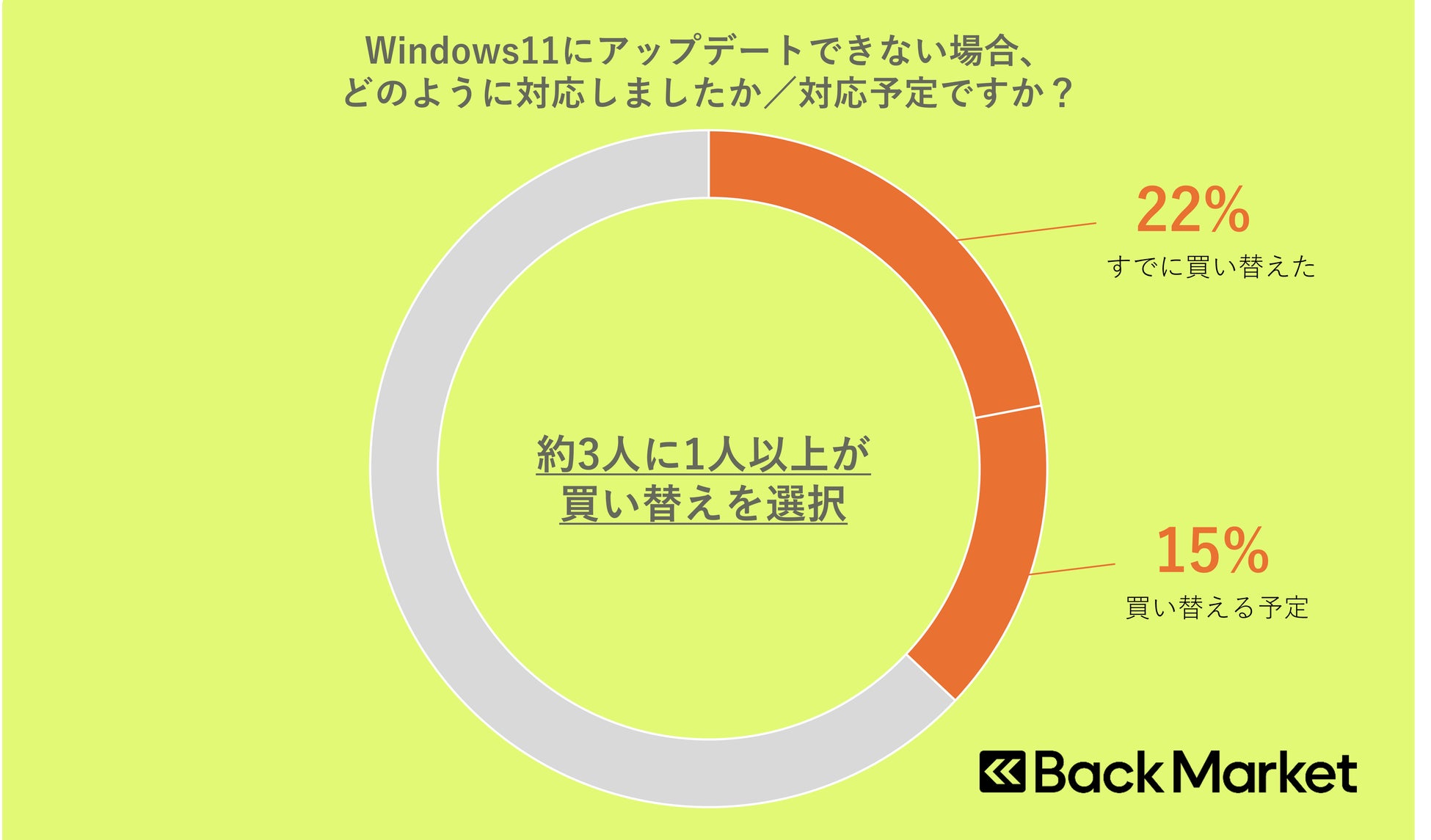 Windows 11にアップグレードできないPCを所有している人に対応策を聞いたところ、すでに買い替えた人は22%、サポート終了を受けて買い替える予定の人は15%となり、3人に1人以上がサポート終了をきっかけに買い替えを決断していることが明らかになりました。
