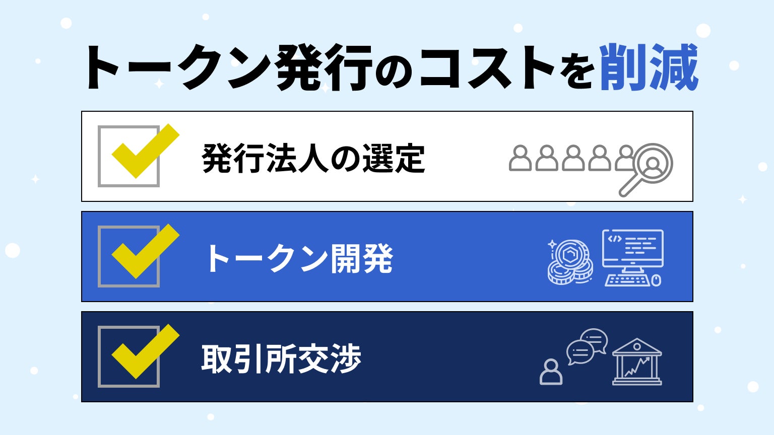 前述の通り、トークンを新たに発行し、国内の取引所にて流通させるハードルは本来非常に高いところ、極限までそのハードルと人的コストを下げることができます。