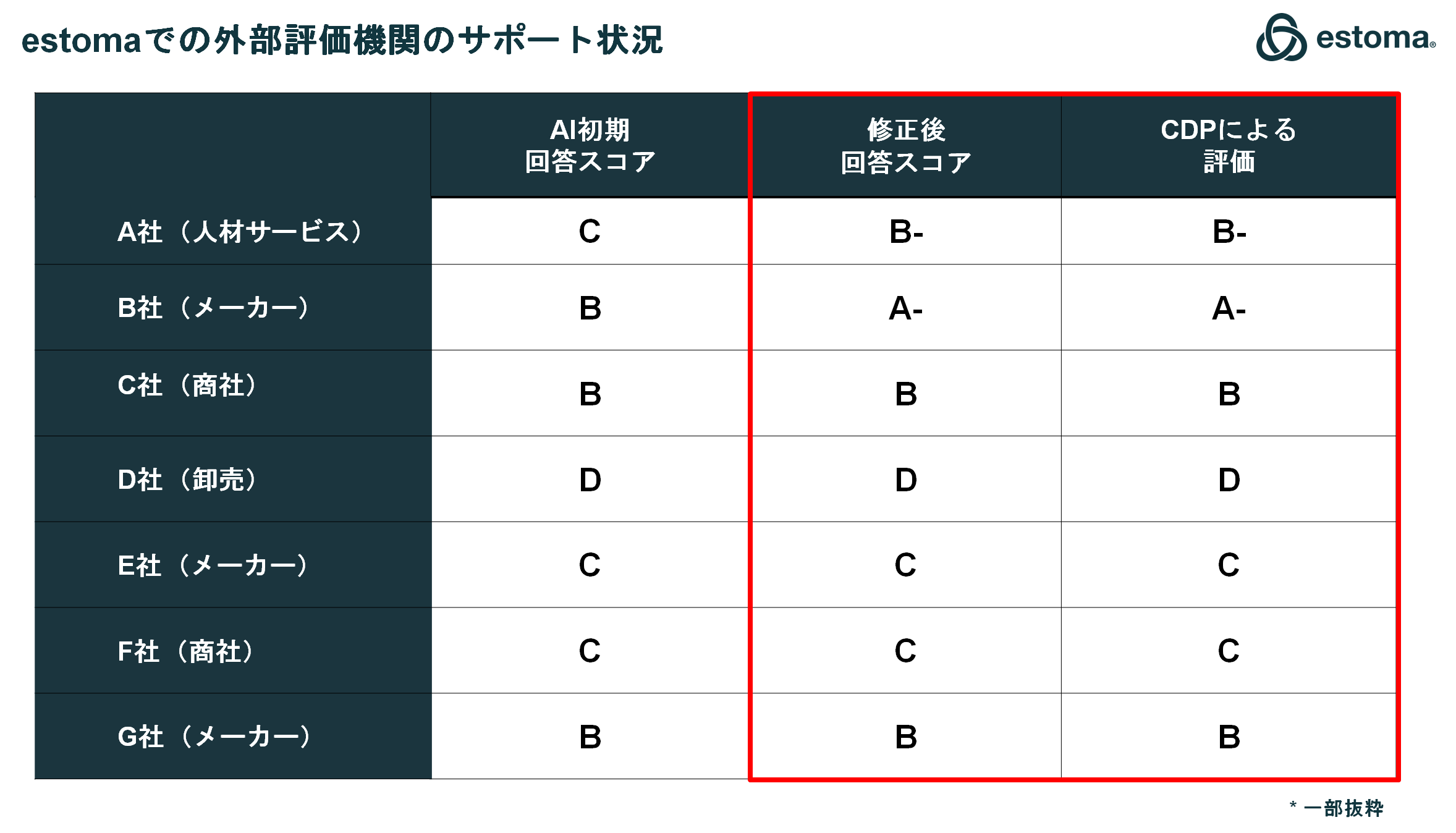 今回、estomaを活用して作成した回答に対するスコア予測は、CDP2025で実際に発表された最終スコアと完全に一致(合致率100%)し、estoma AIの精度が実証されました。