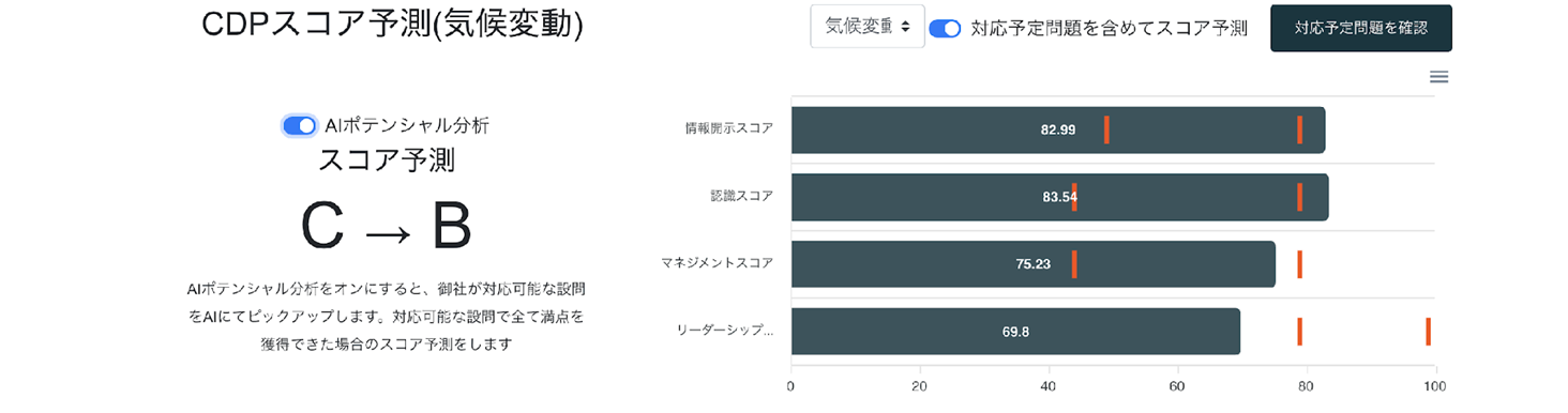 estomaでは、AIを活用したCDP回答自動生成機能を提供しており、CDP質問票に対する一次回答(下書き)を自動で生成することが可能です。さらに、生成された回答に対しては、CDPの評価ロジックを踏まえたスコア予測を自動で実施します。これにより、企業は回答を提出する前の段階で、最終的な評価水準を極めて高い精度で把握することができます。