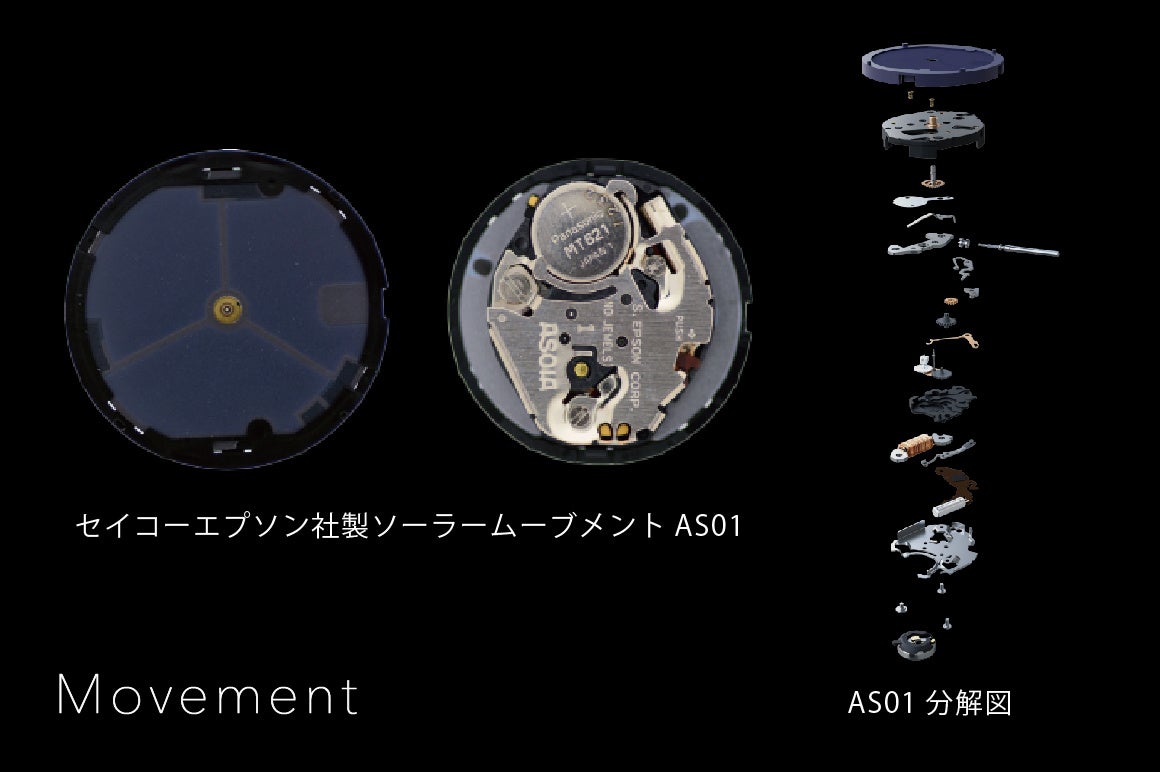 世界で初めてクオーツウオッチを開発したセイコーエプソン社製の日本製ソーラームーブメントである AS01を搭載。メインプレートにはリサイクルプラスティックを使用しています。