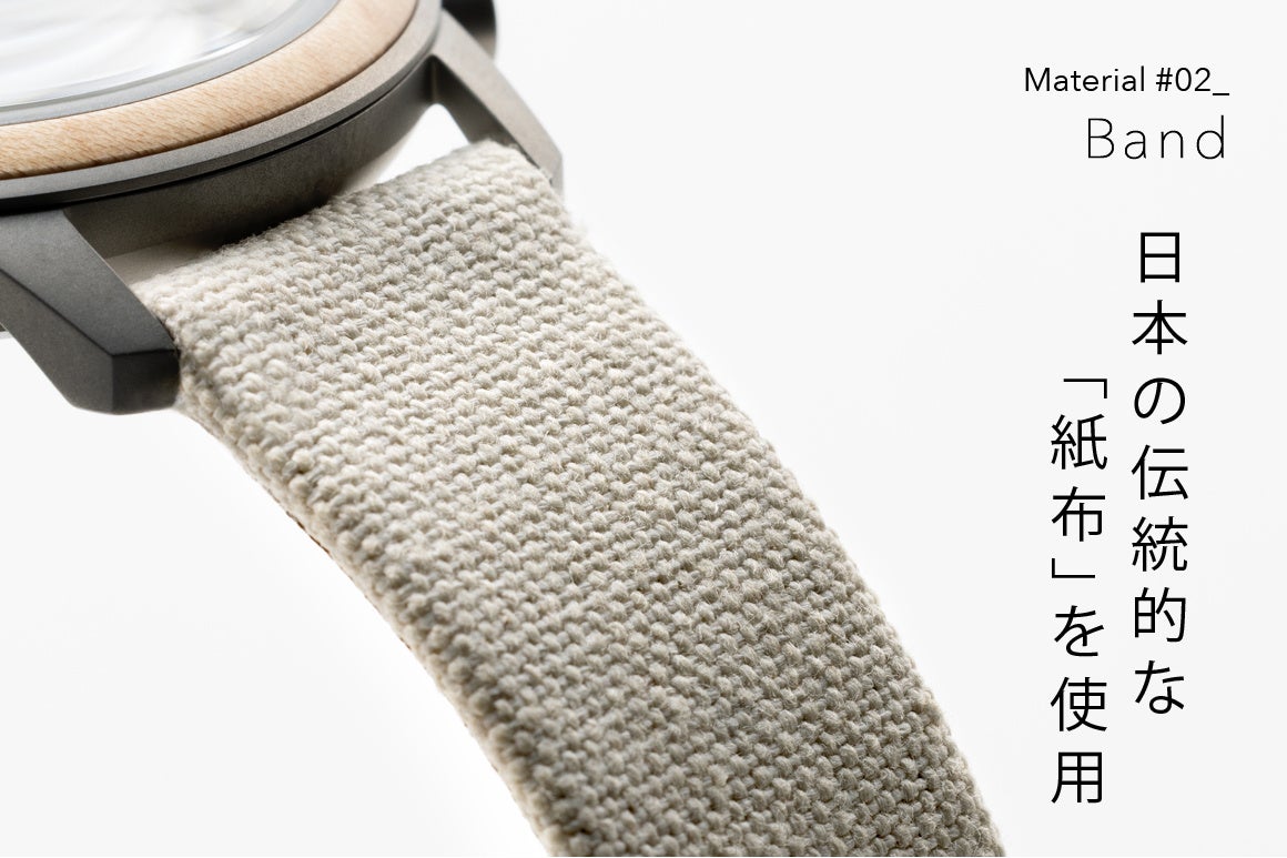 ケースにはステンレススチール、ベゼルには天然素材である木材が使用されています。使用する木材は 2種類を厳選。バイオリンなどの楽器屋家具に使用されるメープルウッド、リラックス効果のあるサン ダルウッド。