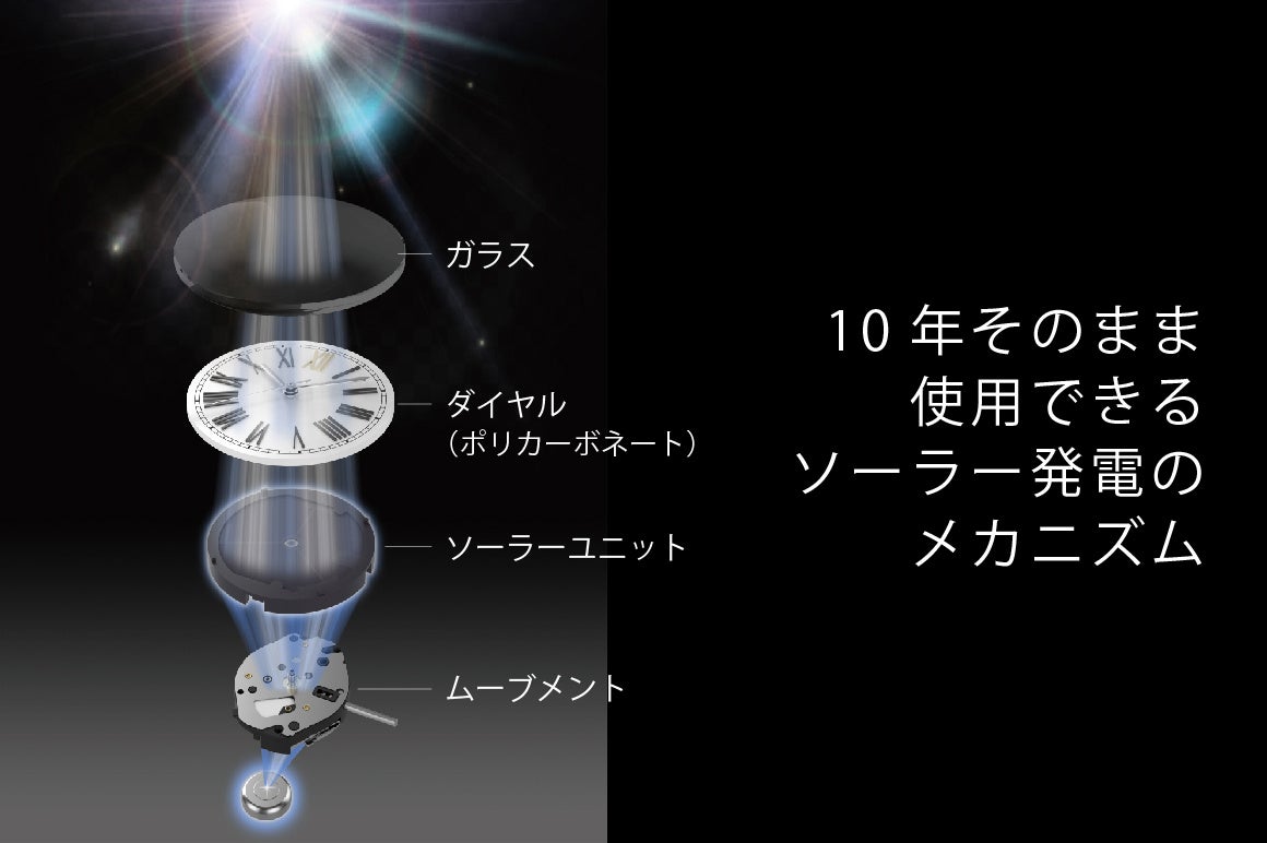 ダイヤル面で受けた光はソーラーユニットで電気エネルギーに変換され、電気エネルギーは二次電池に蓄 えられ、時計を動かすエネルギーとして使用される構造。二次電池とは、乾電池やボタン電池のような使 い捨ての電池とは異なり、充電と放電を繰り返しながら長期間使用できる環境に配慮した電池です。使用 条件や使用環境により異なリマスが、長期的な使用を前提としており、10年後も使用できることを想定 した仕様となっています。二次電池は交換することが可能です。