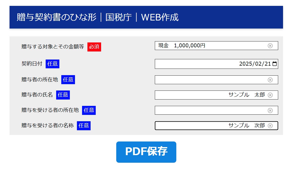 「贈与契約書のひな形」ツールは、Web上で必要な事項を入力するだけで契約書が完成します。