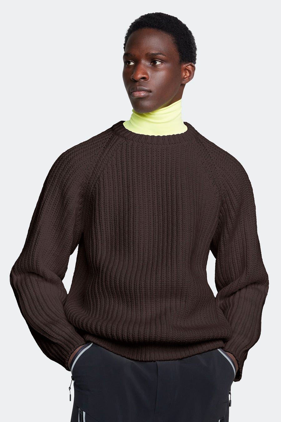 ニットウェアからは、リラックスした雰囲気を感じさせる、チャンキーウールのリブニット「クレリア クルー」が登場します。細部にまで起毛を施し、柔らかく、肌に馴染むような質感を実現しました。