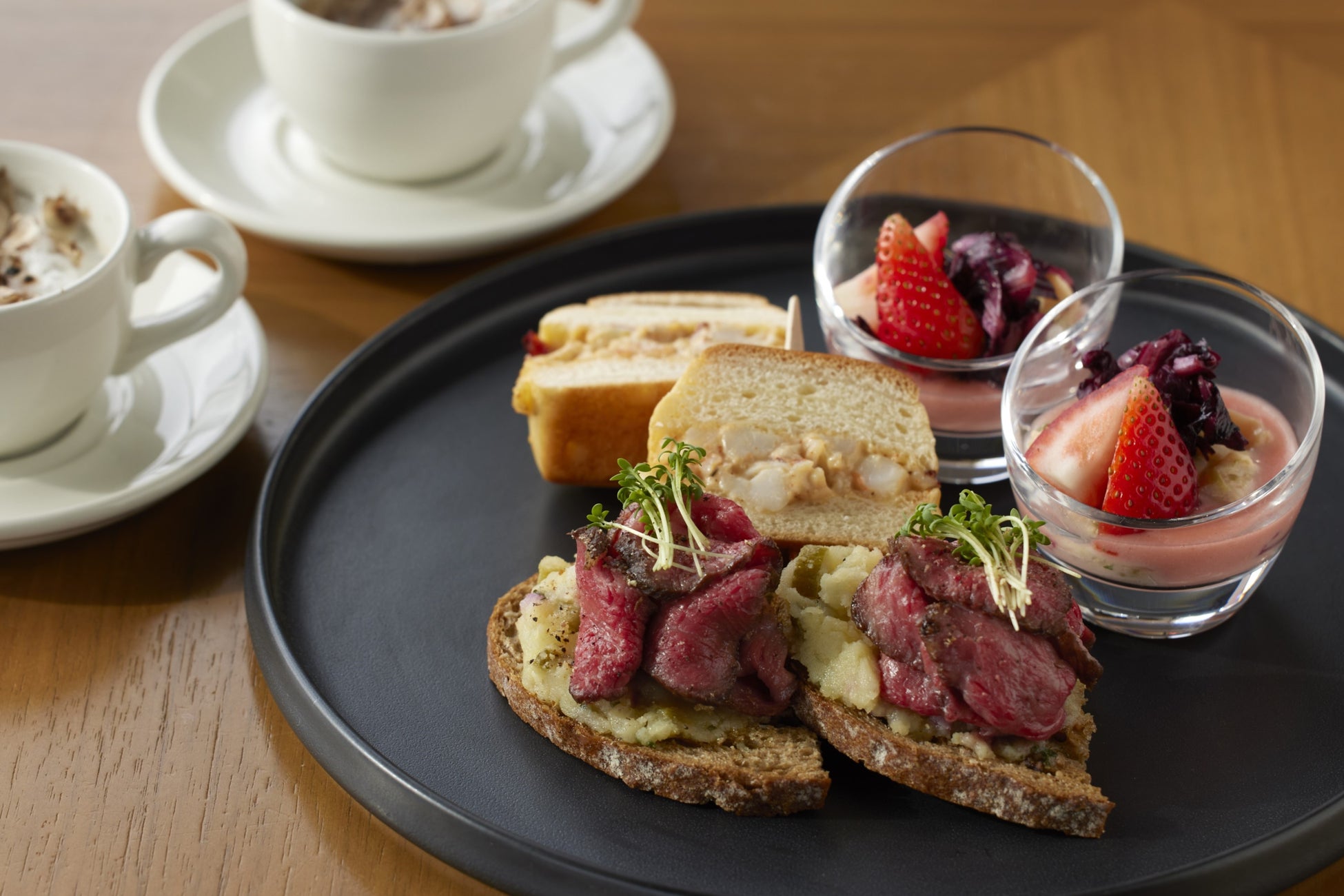 セイボリーには、石井総料理長が腕をふるった冬の味覚が並びます。ぷりぷりのロブスターとシュリンプはバターで低温調理し、ミルクパンで挟んだサンドイッチに。丁寧に火入れした和牛ローストビーフは、なめらかなポテトサラダとともに、深みのある味わいを引き立てます。マッシュルームクリームスープは水を一切使わず、素材の旨味と香りを凝縮。フジアトランティックサーモンのマリネは、タルタル仕立てにし、フレッシュなイチゴとの相性も抜群です。