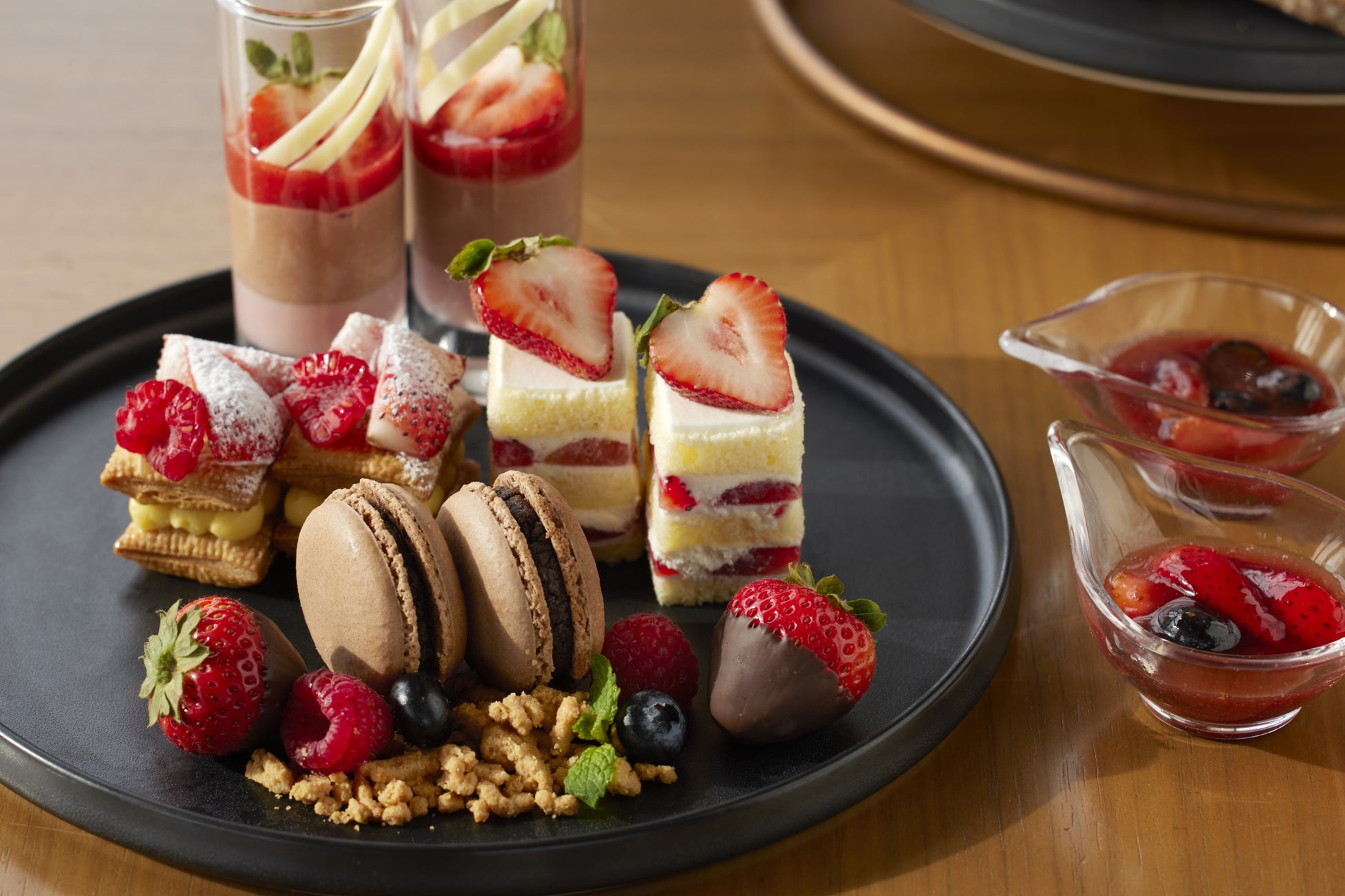 主役は、みずみずしく香り高い旬のイチゴをふんだんに使った4種のスイーツ。定番のショートケーキは、ふわふわのスポンジに、お好みでたっぷりかけられる濃厚なベリーソースが絡み合い、果実の甘みが口いっぱいに広がります。サクサクのパイ生地が香ばしいイチゴのミルフィーユは、まろやかなカスタードクリームとイチゴが織りなす贅沢な層が魅力。イチゴと2種のチョコレートムースは、とろけるような口当たりと濃厚な味わいが特徴です。さらに、自家製のチョコレートマカロンにはチョコレートがけのフレッシュなイチゴを添えて、ティースタンドを一層華やかに彩ります。