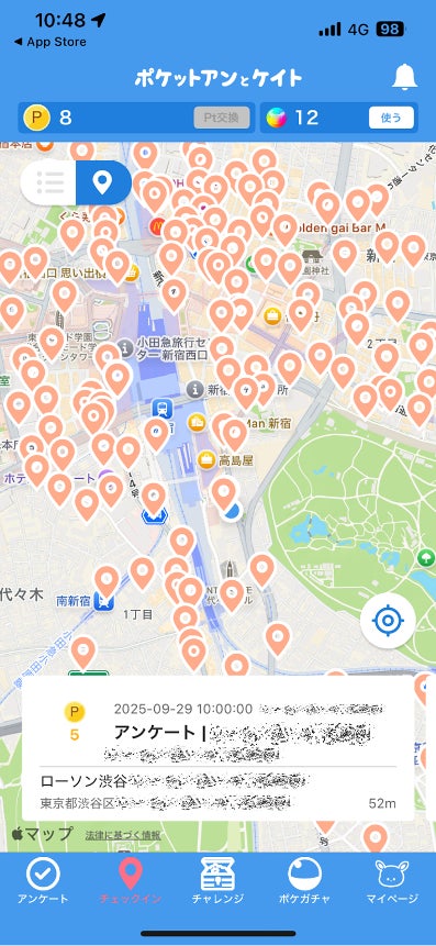 今回のチェックイン機能は地図上にピンが立っている場所であれば、1人が何か所でも回答をすることが可能なので、買い物や散歩の「ついで」にその場所に行けばいつでもポイントを獲得することができます!