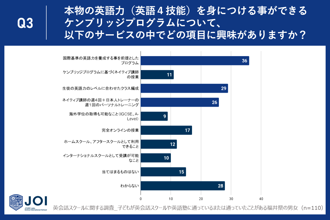 Q3で「本物の英語力(英語4技能)を身につける事ができるケンブリッジプログラムについて、以下のサービスの中でどの項目に興味がありますか?(複数回答可)」と質問したところ、福井県で最も多かったのは「国際基準の英語力を養成する事を前提としたプログラム」で36名でした。次いで、「生徒の英語力のレベルに合わせたクラス編成」には29名、「ネイティブ講師の週4回+日本人トレーナーの週1回のパーソナルトレーニング」には26名が興味を持っています。一方で、「インターナショナルスクールとして受講が可能なこと」や「海外学位の取得も可能なこと(IGCSE、A-Level)」に関心を持つ人はやや少なめで、それぞれ10名、9名の回答でした。これらの結果から、多くの人は実用的な英語力の養成や個別のニーズに応じた指導に重きを置いていることが伺えます。