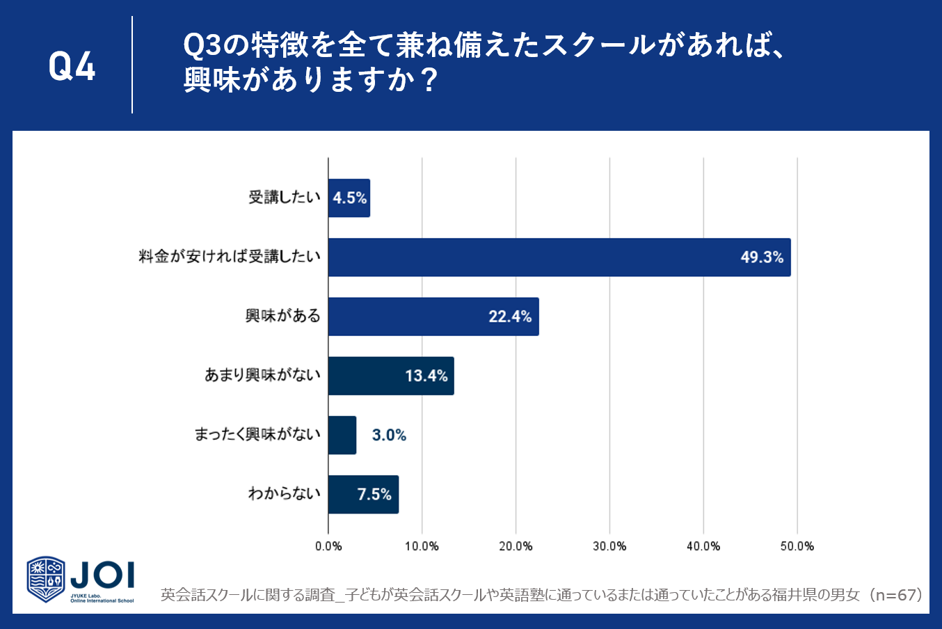 Q4で「Q3の特徴を全て兼ね備えたスクールがあれば、興味がありますか?」と質問したところ、福井県では4.5%が受講を希望し、49.3%は料金が手頃であれば受講したいと考えています。さらに、22.4%は興味を示していると回答しました。多くの人がこのような特徴を持つスクールに一定の興味を示していることが分かります。