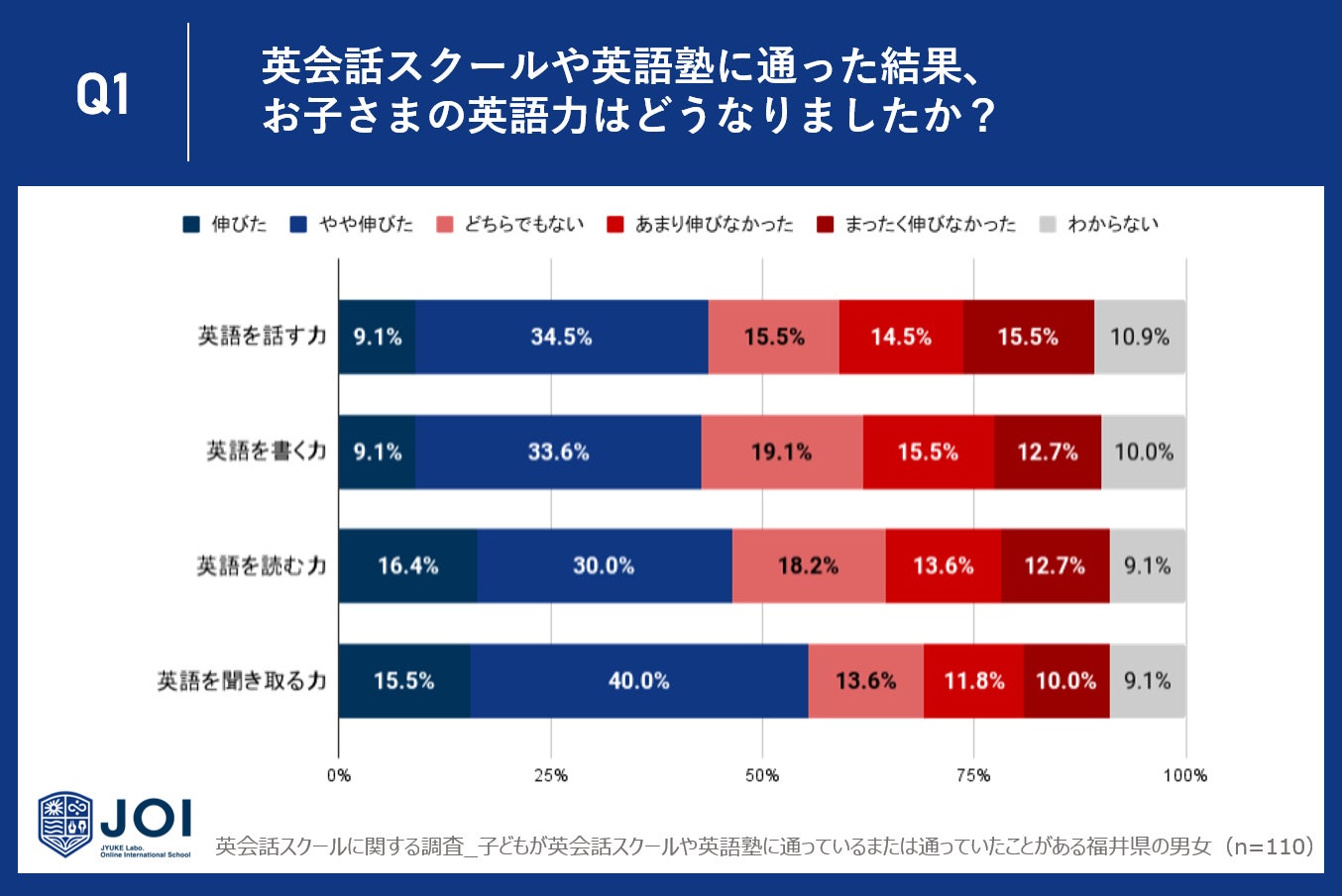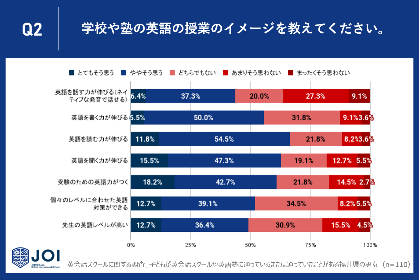 今回は、子どもが英会話スクールや英語塾に通っているまたは通っていたことがある福井県の男女110人に、英会話スクールや英語塾の効果に関するアンケート調査を実施しました。