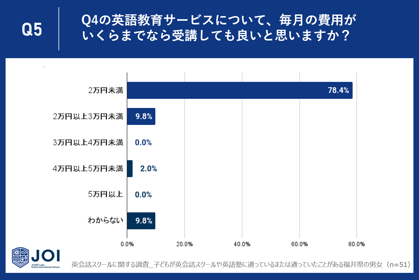 Q4で「受講したい」「料金が安ければ受講したい」「興味がある」と回答した人に、Q5で、「Q4の英語教育サービスについて、毎月の費用がいくらまでなら受講しても良いと思いますか?」と質問したところ、最も多い78.4%の回答者は2万円未満が適切と感じています。9.8%は2万円以上3万円未満と答えました。対照的に、4万円以上の費用を考える回答者は極少数で、4万円以上5万円未満が2.0%、3万円以上4万円未満、5万円以上が0.0%でした。これにより、福井県では多くの人が3万円未満の価格帯を望んでいることが明らかとなりました。