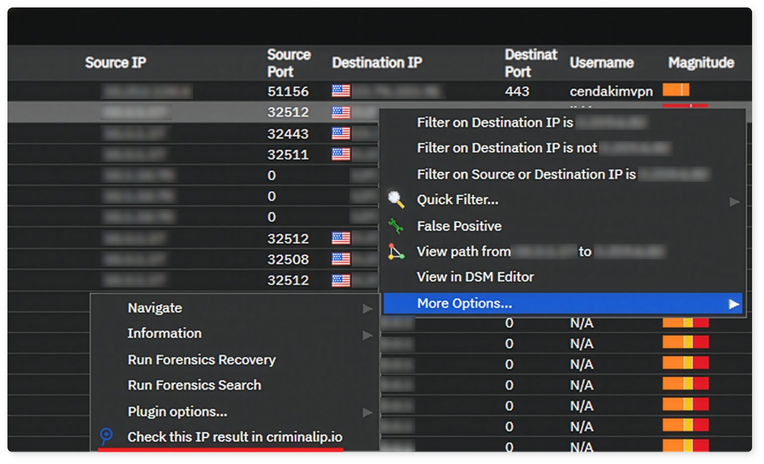 QRadar に転送されたトラフィックデータは Criminal IP API を通じて解析され、その結果は SIEM インターフェース上に直接反映されます。