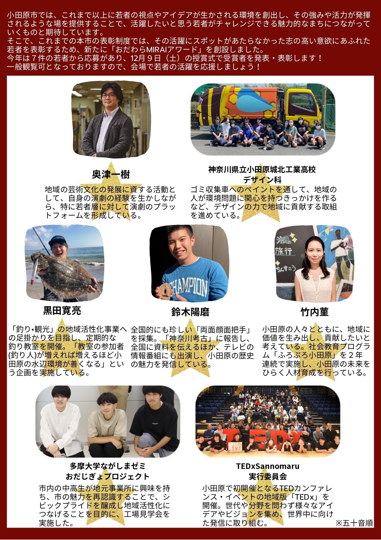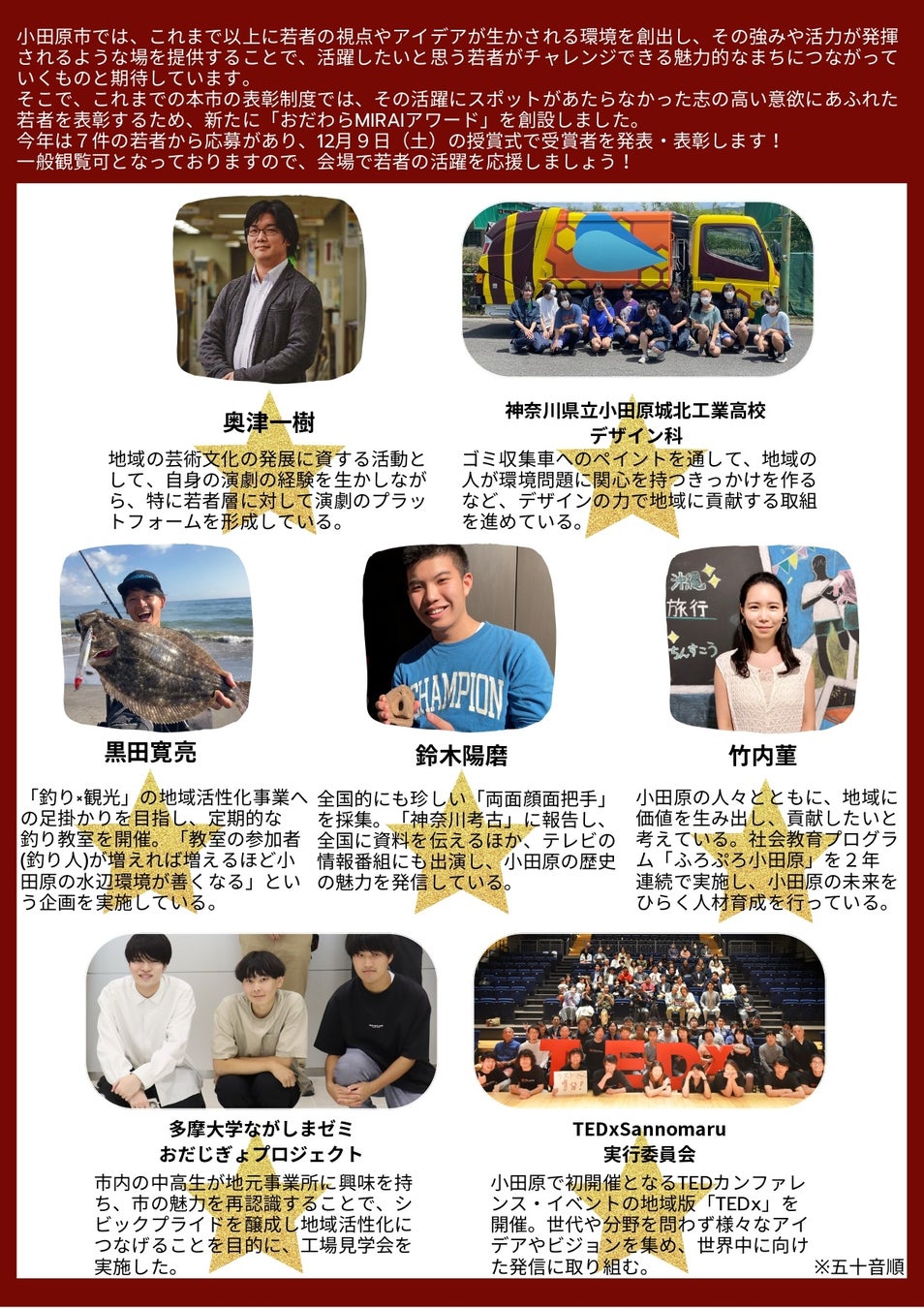 そこで、今年の6月、これまでの市の表彰制度では、その活躍にスポットがあたらなかった志の高い意欲にあふれた若者を表彰するため、新たに「おだわらMIRAIアワード」を創設しました。